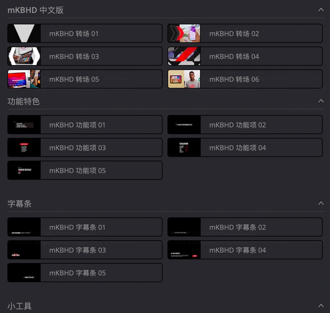 mKBHD 插件带来DaVinci Resolve 版本。查看我们与世界顶级科技博主密切合作打造的插件,即可为您的剪辑作品增添 MKBHD 的魔力。最实用、最巧妙的剪辑技巧被巧妙地整合并精简成便捷的工具,使用起来极其简单,并允许您在 100% 验证过的剪辑效果和功能的基础上进行创作,正是这些效果和功能让 Marques Brownlee 登上了 YouTube 排行榜的榜首。这 51 个现成的预设旨在让您通过清晰的视觉效果和引人入胜的素材处理工具获得完美的效果,将为您节省大量时间和精力。