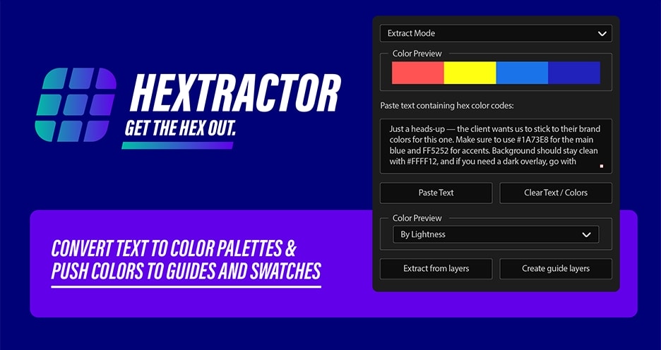 - 提取所有内容:从粘贴的文本、AE 图层或图像中抓取十六进制代码。然后自动生成颜色控制。无需手动输入或添加颜色。非常适合粘贴品牌指南或电子邮件文本。