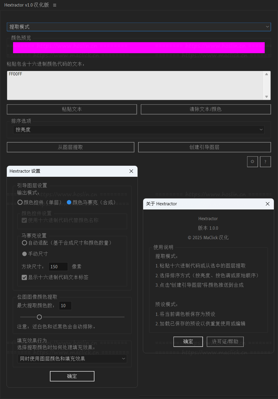 使用 Hextractor 立即从文本、图层或图像中提取十六进制颜色代码,并在专用合成中生成颜色控件和色板。Hextractor 还允许您保存/加载调色板,以便轻松切换项目。