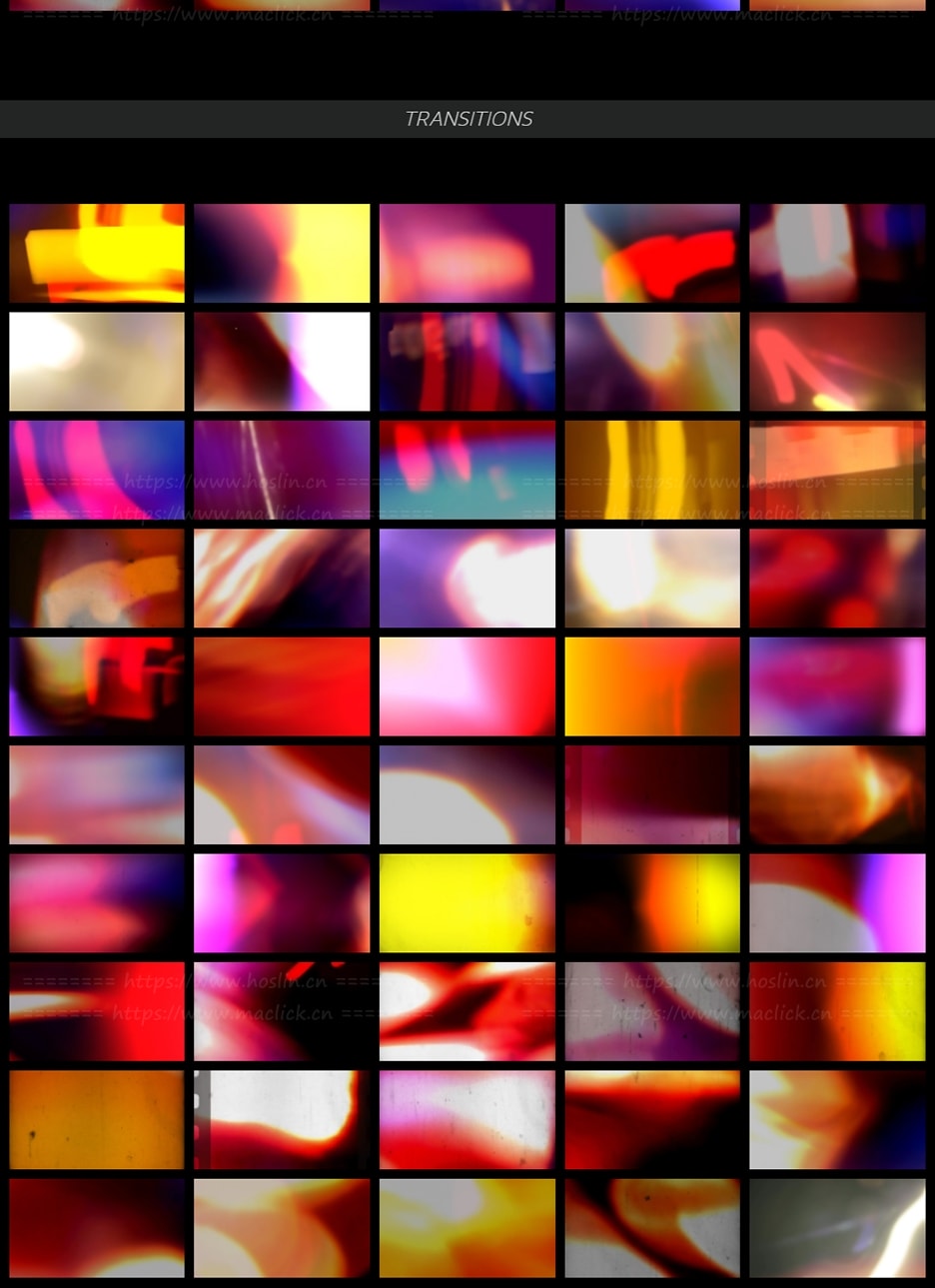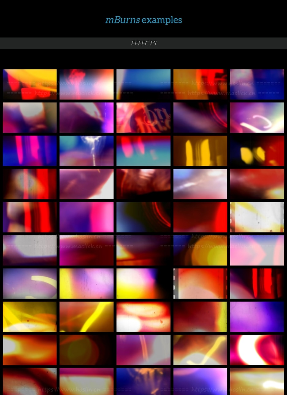 100款优雅复古胶片镜头漏光烧伤炫光视频叠加转场特效动画,包含50个叠加光效和50个转场动画。可用于任何合成软件和非编软件中,支持任意的混合和复合模式。只需导入视频编辑软件中,放入原视频轨道之上,选择合适的叠加方式即可观看到效果(建议选用Screen-屏幕方式叠加),您还可以进一步调整素材的透明度,饱和度,色调,对比度,速度,以达到更好的效果。
