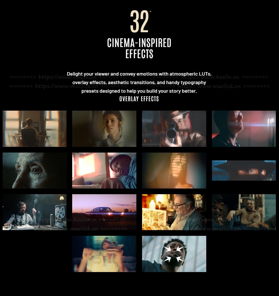 ⭐️ 隆重推出 mStyle Cinematic 一款必备工具包,可将您的内容转化为沉浸式影院体验,让观众如痴如醉。? mStyle Cinematic 是 Final Cut Pro 爱好者追求专业影院级效果的终极工具包,助您释放大屏幕的魔力。5个LUT、14个叠加特效、10个文字标题排版动画和9个转场将好莱坞的魅力带到您的指尖,将您的内容提升到非凡的高度。mStyle Cinematic 拥有一系列炫目的特效、强大的转场效果和精致的排版,助您将素材转化为沉浸式影院体验,俘获观众,释放您真正的创作潜力。灯光、摄像机、开拍 – 欢迎来到卓越的电影世界。