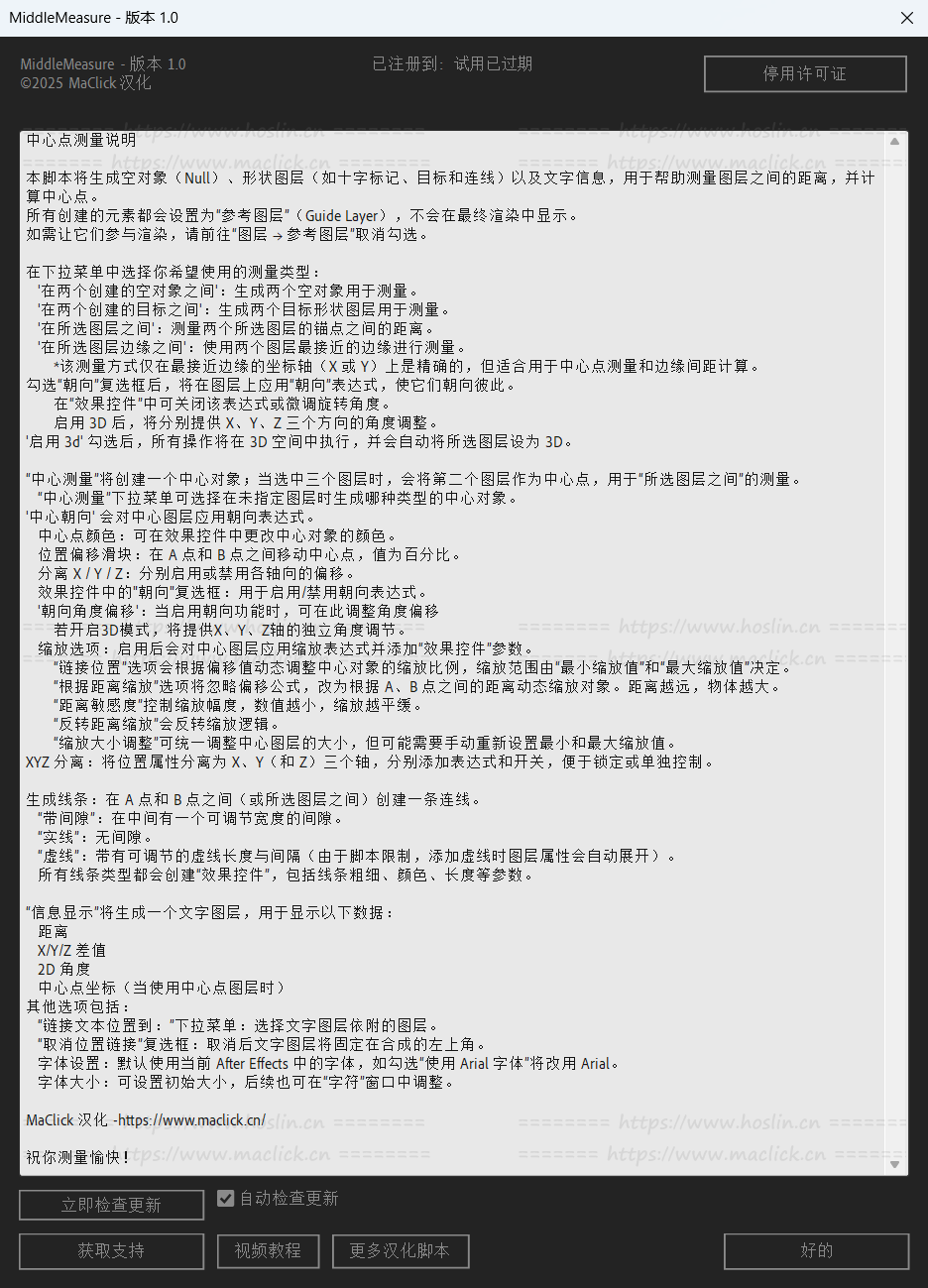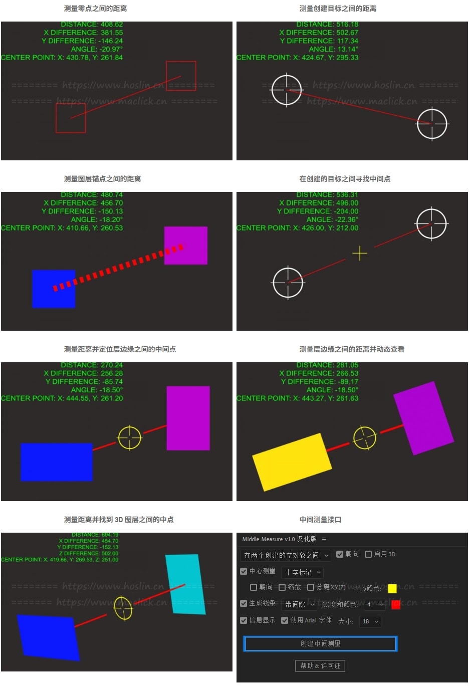 中间测量将创建空值和目标值,并在它们之间进行测量,或者也使用选定的图层。即使在动画状态下也是如此!另外,它还创建了一个测量信息显示,可以访问其他表达式可以访问的计算距离。