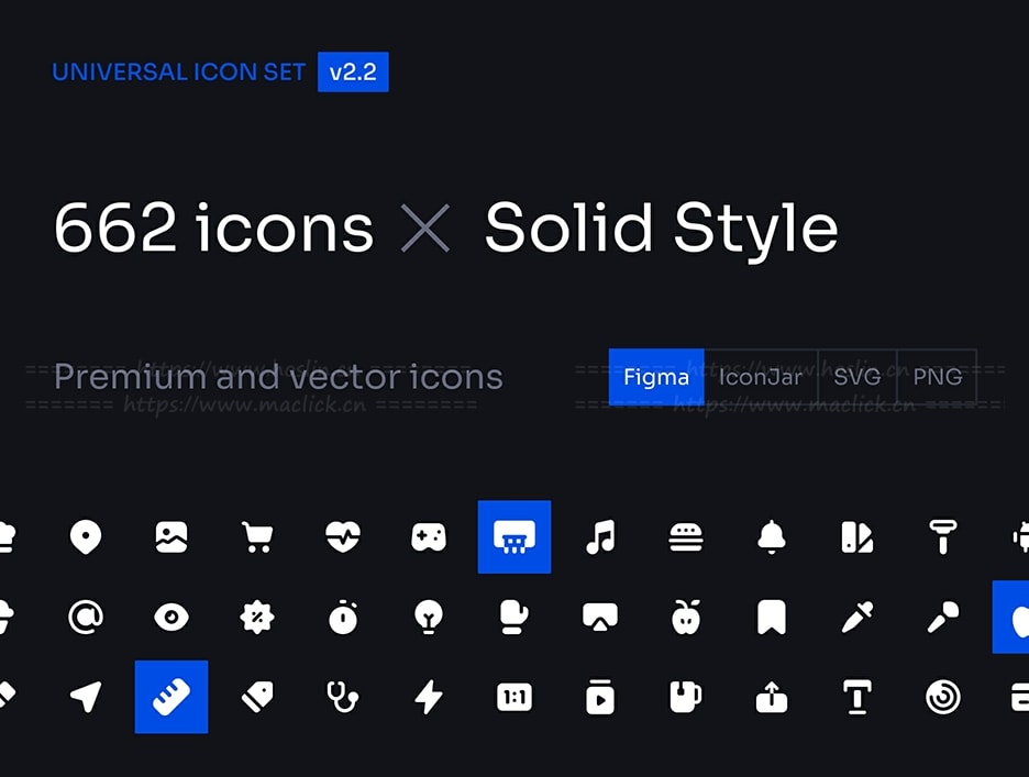 Universal Icon Set 2.2 图标包收录了约662 个精选实心图标,基于 24×24 像素网格、2px 描边设计,线条流畅、几何精确。图标文件支持矢量 SVG、PNG、Figma 和 IconJar 格式,易于调整样式与配色,在各类网页、App、设计系统中均可一键替换 Solid 风格。涵盖天气、日期、社交、多媒体、界面控件等类别,兼容 Figma 组件变体,方便快速集成与统一视觉风格。无论是产品原型、UI 构建还是品牌设计,这套图标都能显著提升效率和专业度。