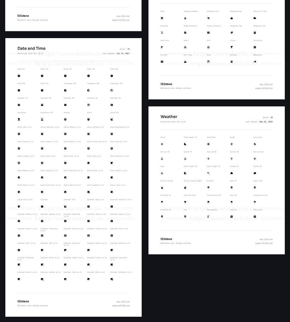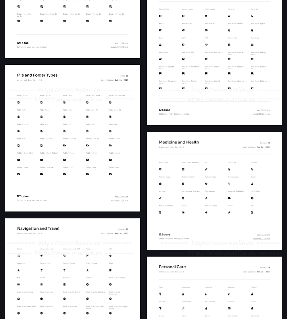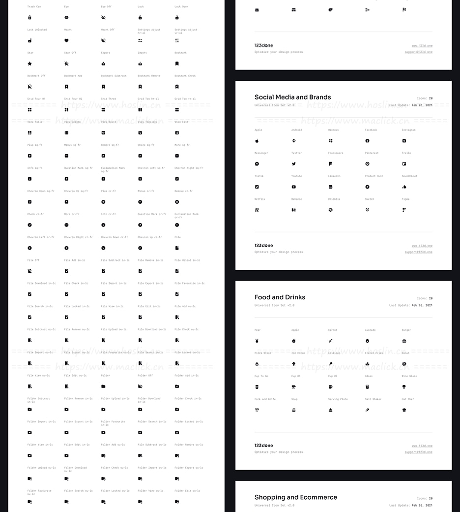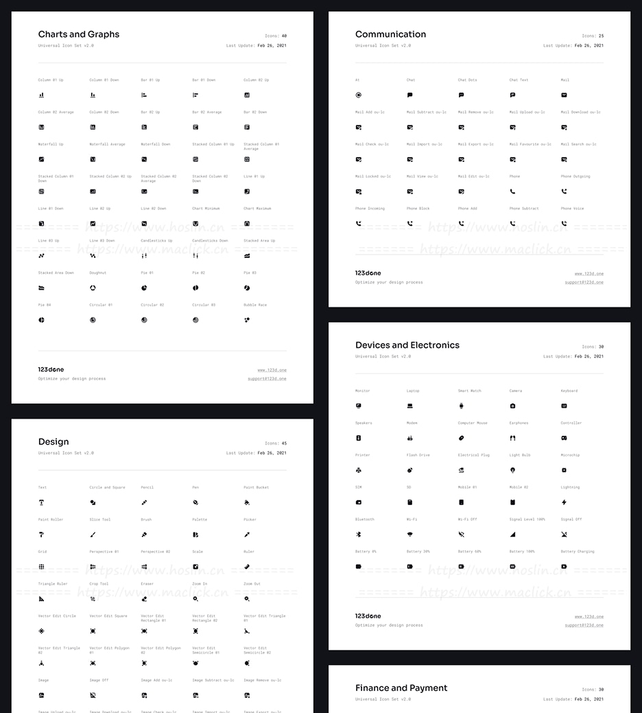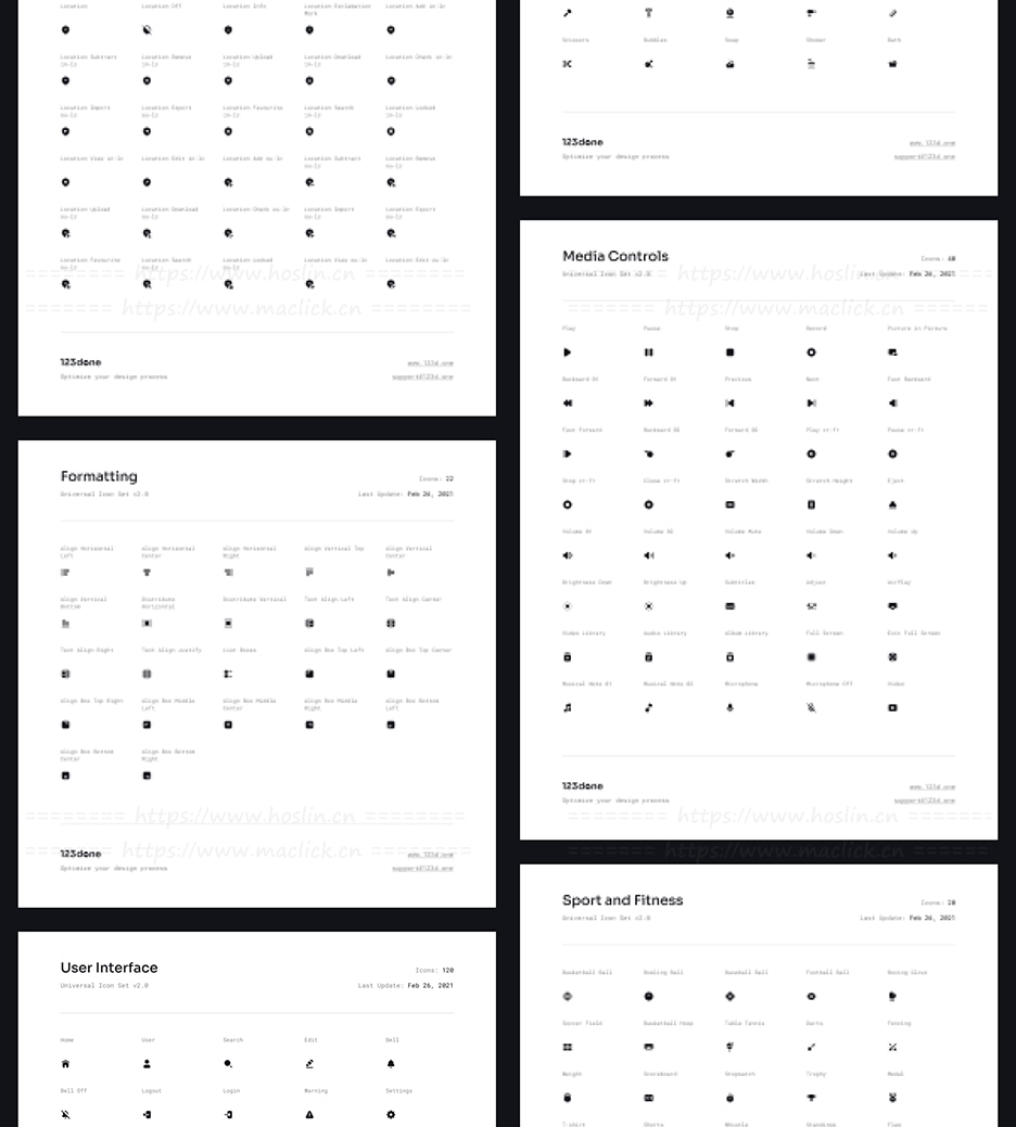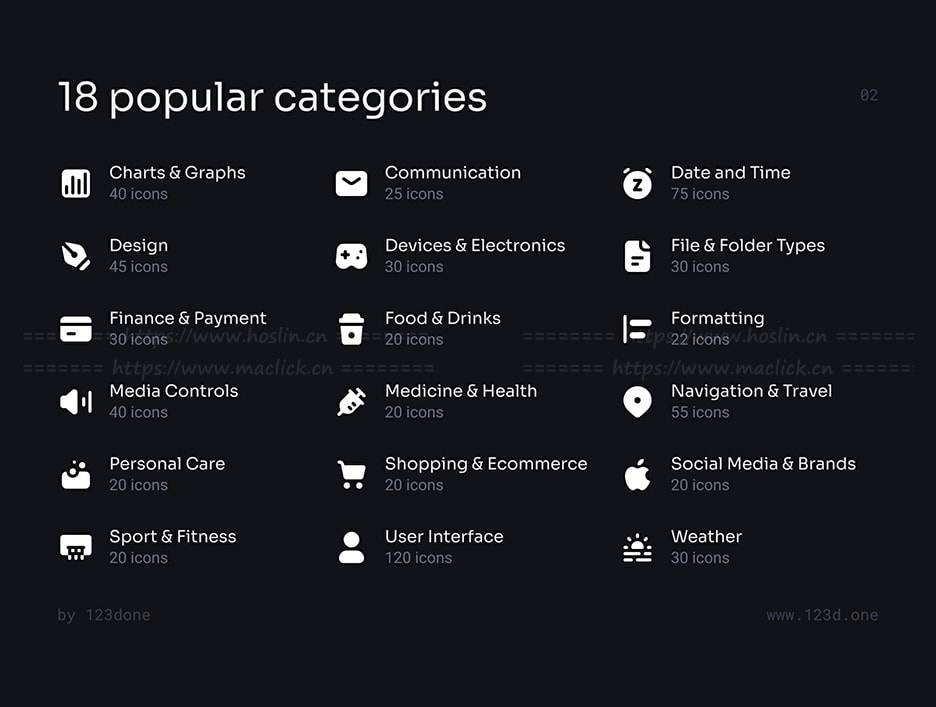 18 个类别:图表和图形、通信、日期和时间、设计、设备和电子产品、文件和文件夹类型、金融和支付、食品和饮料、格式化、媒体控件、医药和健康、导航和旅行、个人护理、购物和电子商务、社交媒体和品牌、运动和健身、用户界面、天气