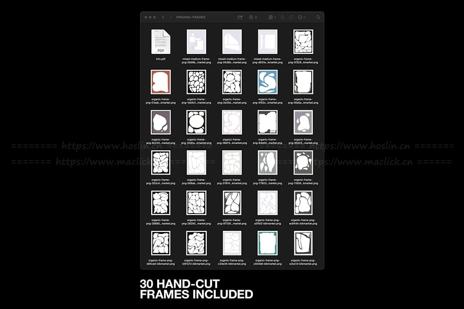 隆重推出“Organic Frames”一套卓越的优质有机抽象相框素材,精心手工剪裁,品质卓越。这些相框源于真实纸张,拥有真实的纹理质感。您可以将相框与您自己的图片组合,打造独一无二的布局,或者直接将图片放在相框后方进行快速布局。©BLKMARKET