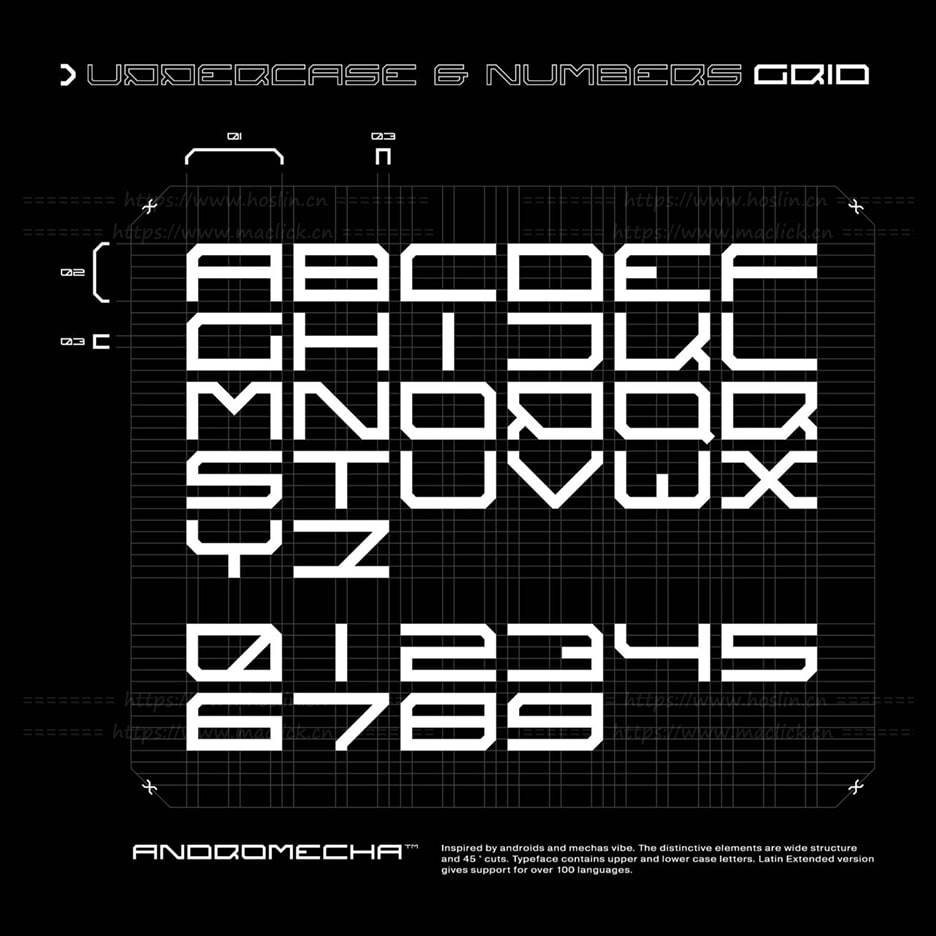 Andromecha 是一款多功能显示字体,融合了大小写字母,适用于各种设计项目。它支持超过 100 种语言,确保了包容性和易用性。Andromecha 的灵感源自机器人和机甲,其宽阔的结构和独特的 45° 切割设计捕捉了机器人和机甲的未来主义气息。无论您是设计徽标、标题、海报还是其他创意项目,Andromecha 都能为您的设计增添一抹现代感和独特性。