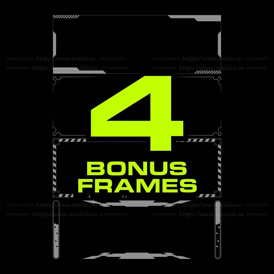 • 额外相框,提升创意:使用套装内含的四个额外矢量相框,进一步提升您的设计。您可以使用它们来框住武器,或将其用于其他用途,例如设计工业风专辑封面。