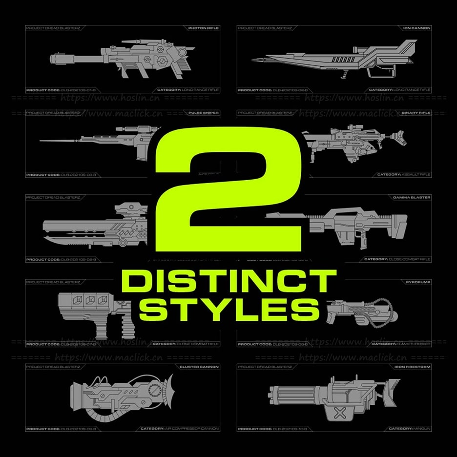 • 独特的造型选择: Dread Blasterz 中的每件武器都有专属的名称、产品代码和两种独特的风格。第一种风格强调轮廓,类似蓝图;而第二种风格则以实心填充的形状和镂空线条为特色。这种灵活性让您可以根据自己的设计需求定制外观。