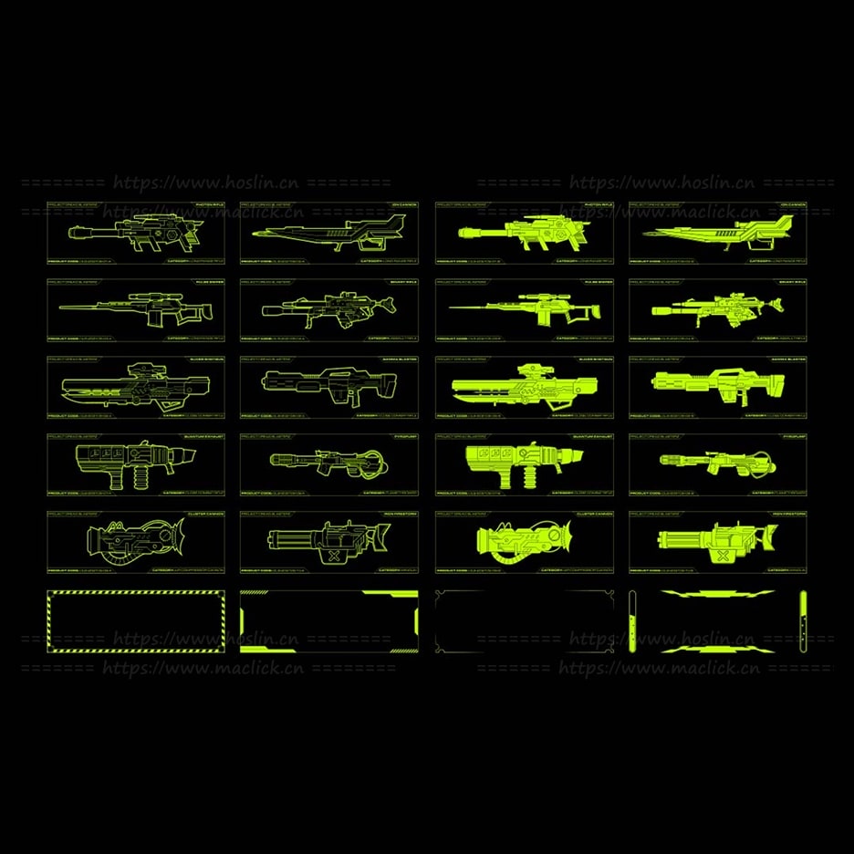 • 适用于所有设计平台:担心兼容性?不用担心。该包包含 52 张 PNG 格式的边框和武器图片,即使您不使用 Illustrator,也能确保无缝集成到各种设计平台。