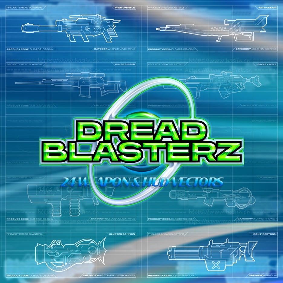 Dreadlabs 推出 Dread Blasterz,这是一款动态矢量素材包,灵感源自未来射击游戏和机甲,为您的艺术作品注入工业未来主义。让您的海报和设计沉浸在激光束、霰弹枪和火焰喷射器的网格中,从《无主之地》、《使命召唤》和《高达》等经典游戏系列中汲取灵感。