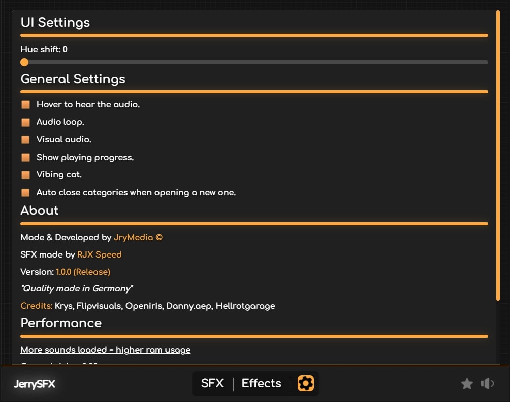 - 此外,您还会发现一个“性能”选项卡,您可以在工作时监控系统性能,确保 JerrySFX 运行顺畅。JerryFlow V2 的经典功能(例如个性化配色方案)也保留了下来,让您可以根据自己的审美偏好调整界面 – 还有更多!