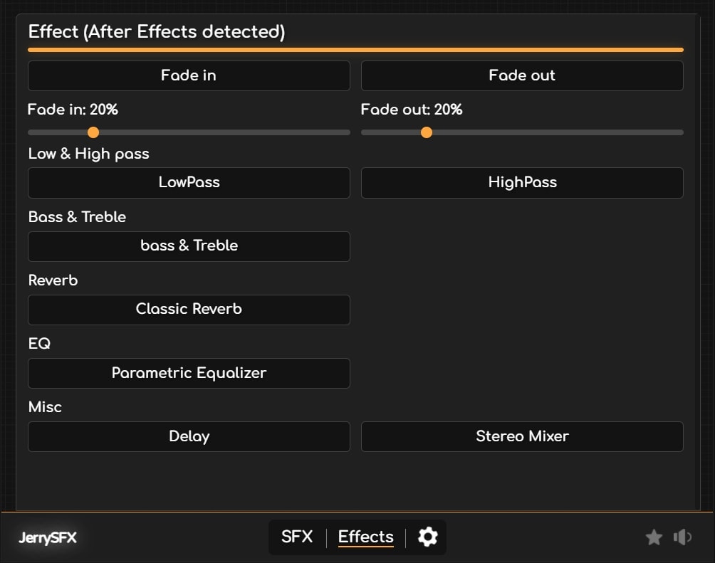 - 一键工作流程增强:选择音频剪辑并通过 JerrySFX 的直观界面立即添加任何 Premiere Pro 的默认效果,从而显著加快音频编辑过程。