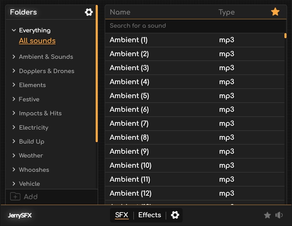 - 个人声音库:将您自己的自定义声音效果添加到 JerrySFX 并将它们组织到个性化文件夹中,以便您扩展库以满足您的独特需求。