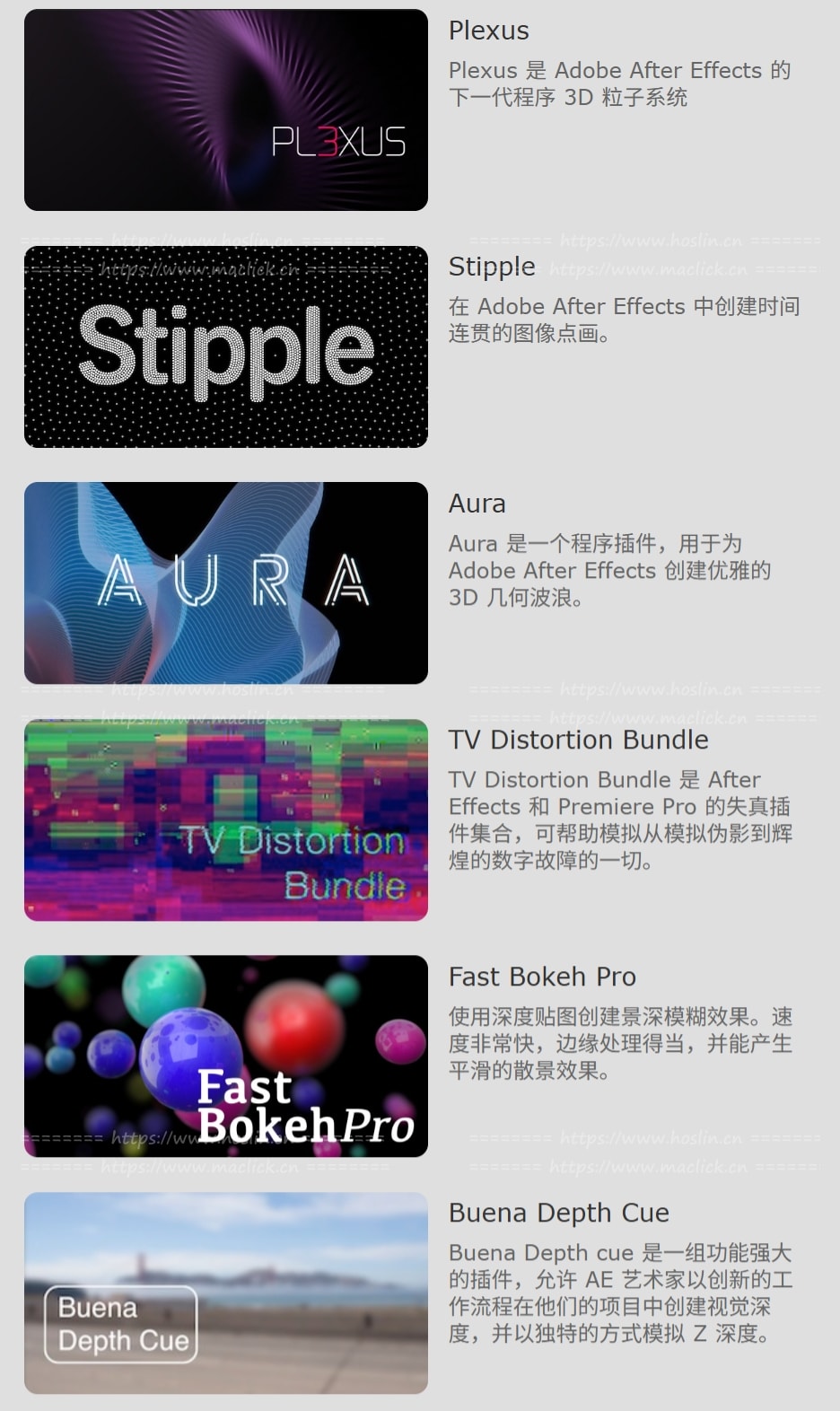 这是由 Rowbyte 团队出品的6款粒子3D波纹深度模糊艺术化故障效果插件,支持After Effects 和Premiere Pro。它们分别包含如下插件: