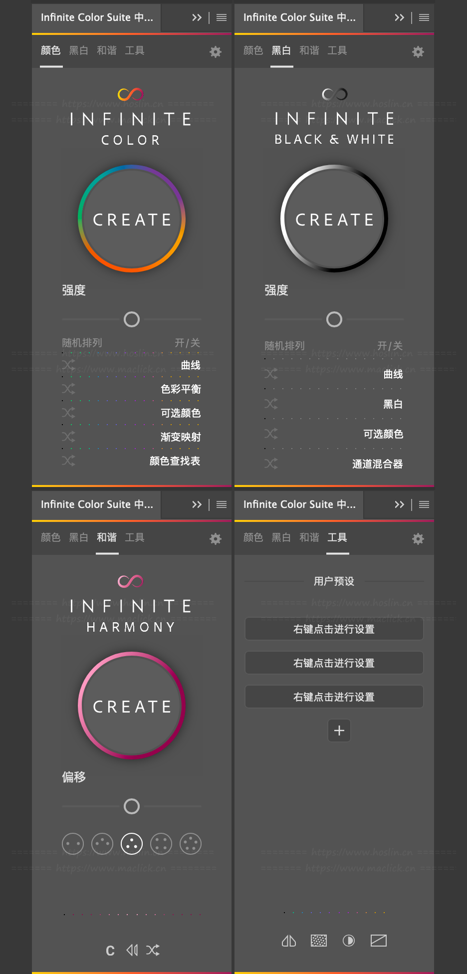 Infinite Color Bundle 将我们广受好评的 Infinite Color(无限色彩)Infinite Black & White(无限黑白)以及Infinite Harmony(无限和谐)这三款工具整合到一个面板中,一键即可随机创造无数专业色调,有效突破固定预设的束缚,助你打造专属视觉风格。插件使用简单,无需调整繁复菜单或滑块,仅需点击按钮即可生成并逐步优化,对创作流程更友好。一站式黑白与色彩管理,结合色彩与黑白调控功能,以及直观引导式色调创建插件 Infinite Harmony,让调色流程更高效快捷。