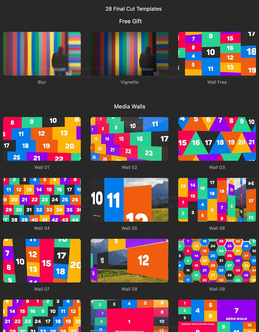 Final Cut Pro 的 Media Walls 为您提供 28 个网格模板(26个媒体墙,1个模糊效果,1个晕影暗角效果)来创建高级多屏合成。以专业的设计和精美的动画展示大量媒体。非常易于使用,只需拖放到您的时间线并按照您想要的方式进行自定义。可以直接在Final Cut Pro中快速轻松地编辑,快速渲染,支持更改持续时间/速度、颜色等参数设置。