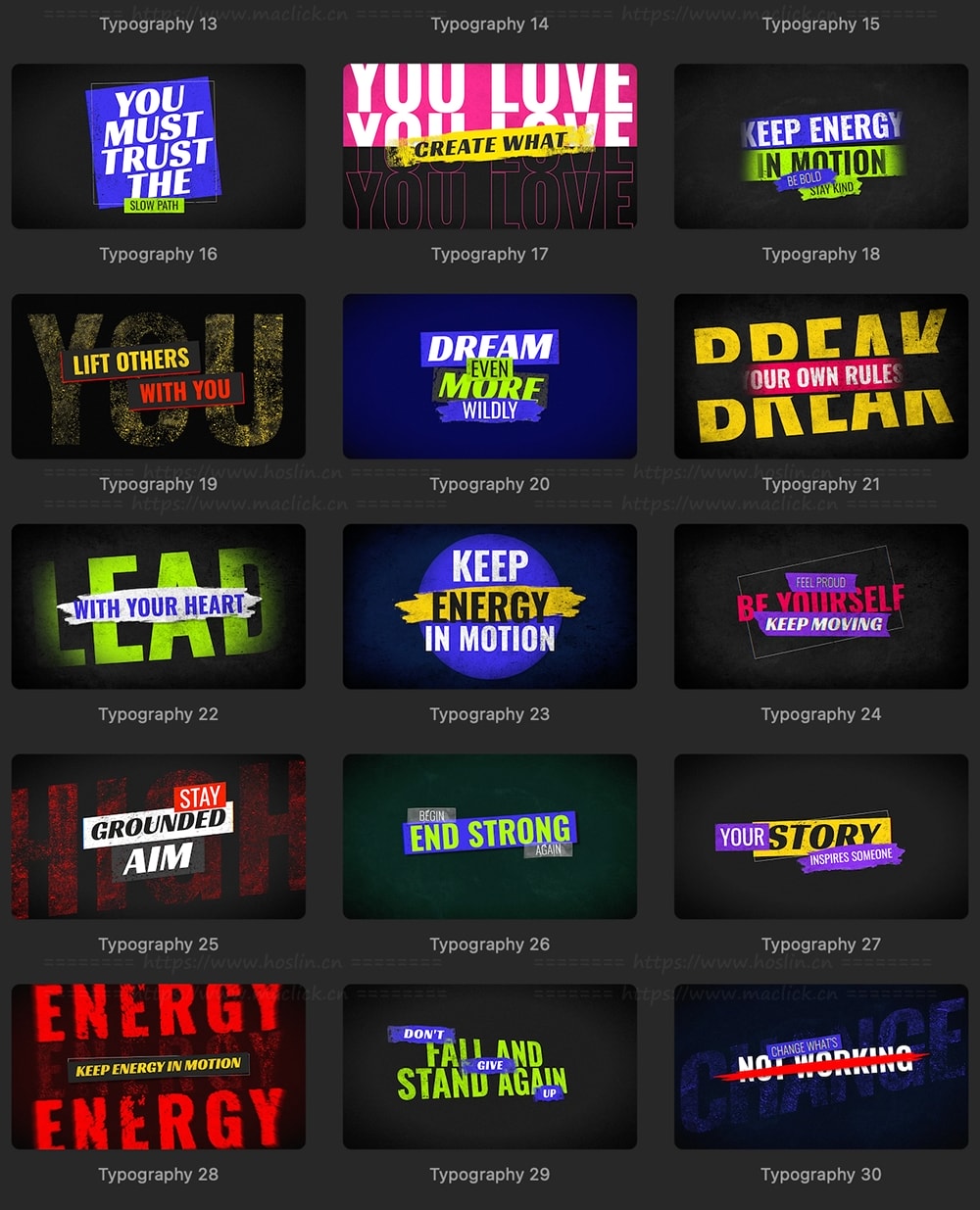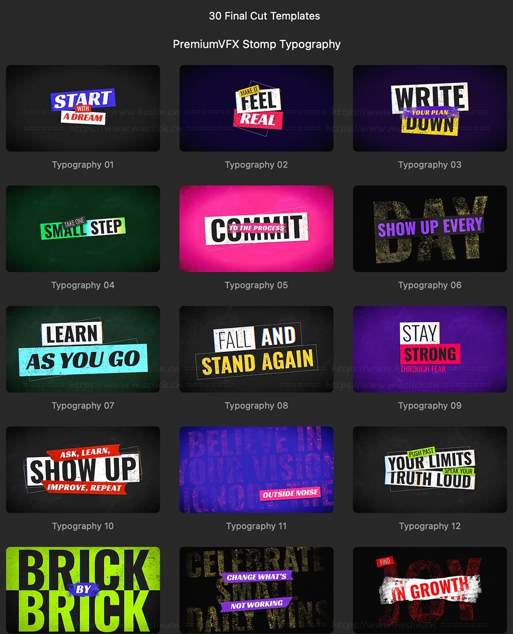 活力四射的标题包,Stomp Typography 内含 30 个预置动画模板,专为追求每个剪辑片段都充满大胆表达、快速动作和纯粹能量的剪辑师打造。专为快速移动和快速剪辑的创作者打造。每个标题都以大胆的动作、动感的节奏和强大的字体设计,紧跟节奏。从预告片到社交媒体内容,此包可为您的剪辑作品带来强劲有力的冲击力,不会浪费任何一帧。