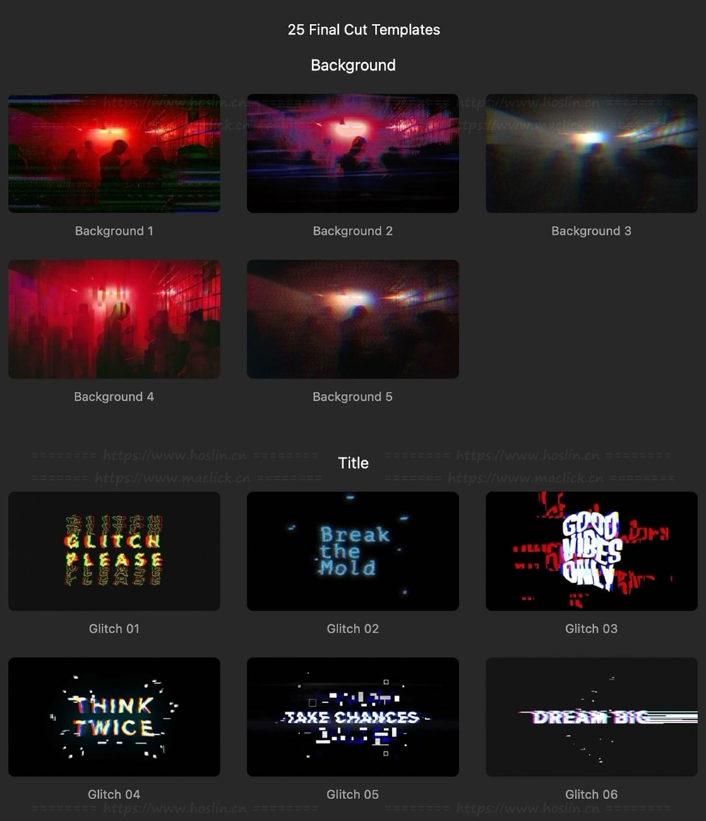 Glitch Pop 是一款包含 25 个 Final Cut Pro 模板的包,可用于为您的视频添加故障效果、扭曲效果和变形效果。它是您打造前所未见的独特作品的一体化解决方案。利用 Glitch Pop 的 5 种适用于 Final Cut 视频的通用背景来掌控创意。简单的拖放定制功能可快速将您的视频变形为完美效果!使用史上最佳故障标题来拥抱您内心的想法,为您的 4K UHD、HD、方形和垂直视频增添色彩。所有 Glitch Pop 模板均可调整以适合常规、方形和垂直视频。