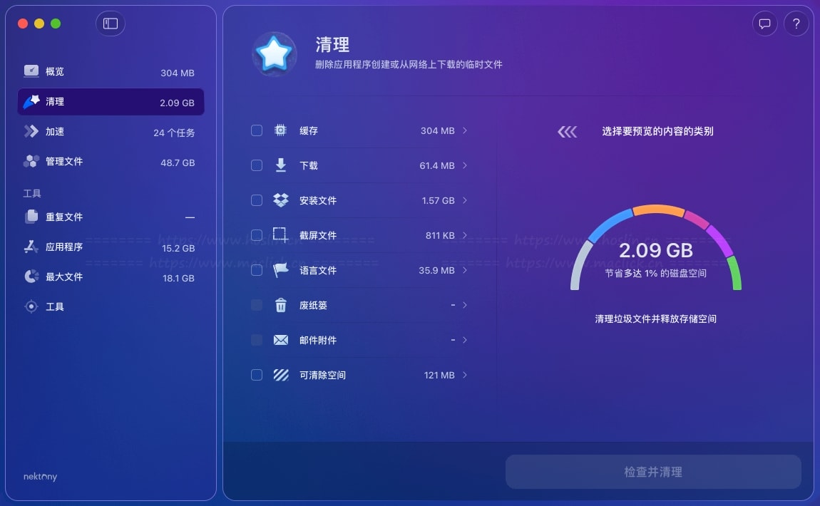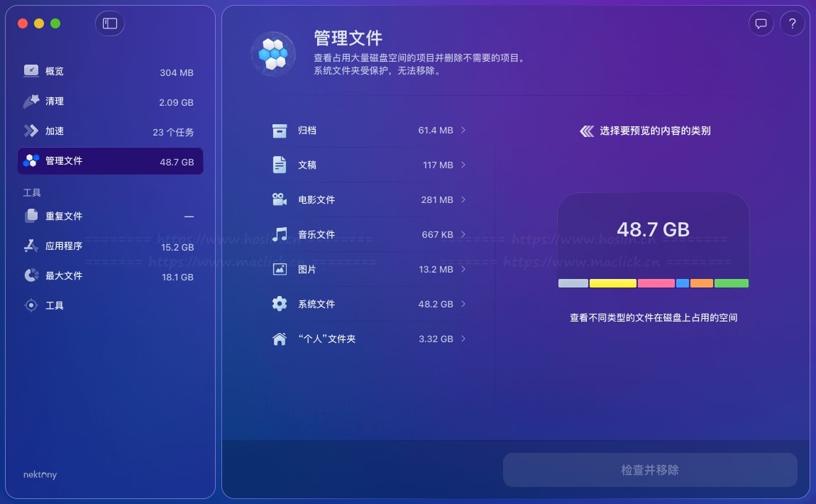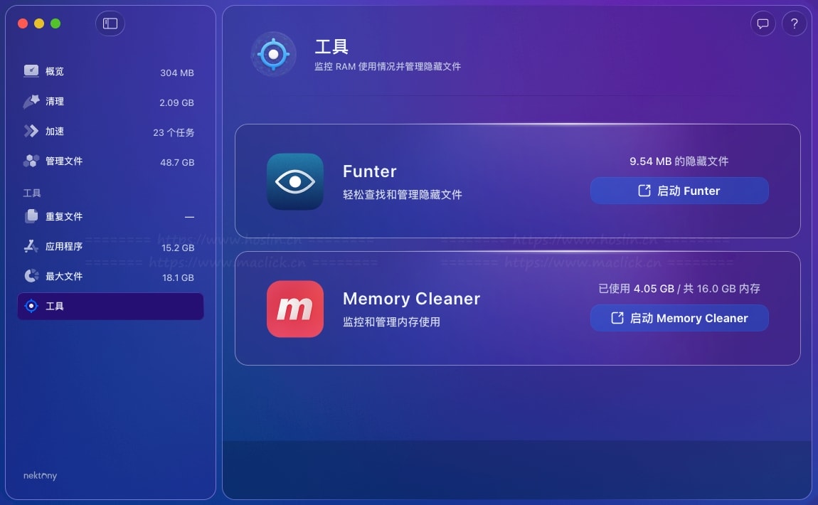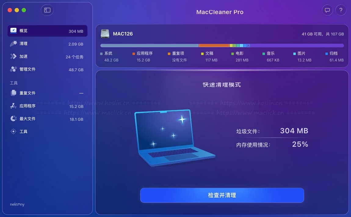 使用 MacCleaner Pro,您可以获得用于深度 Mac 清理的额外工具。它拥有如下主要功能。应用清理和卸载:彻底删除程序;摆脱应用程序的残留;控制启动程序和扩展;更改默认应用。重复文件查找:删除重复文件;清除相似的照片;合并重复文件夹;整理重复内容。磁盘空间分析;分析 Mac 磁盘空间使用情况;查找最大的文件和文件夹;删除旧的未使用的文件;检查任何云存储或外部硬盘驱动器的磁盘空间。使用MacCleaner Pro,安全,高效,性价比高。