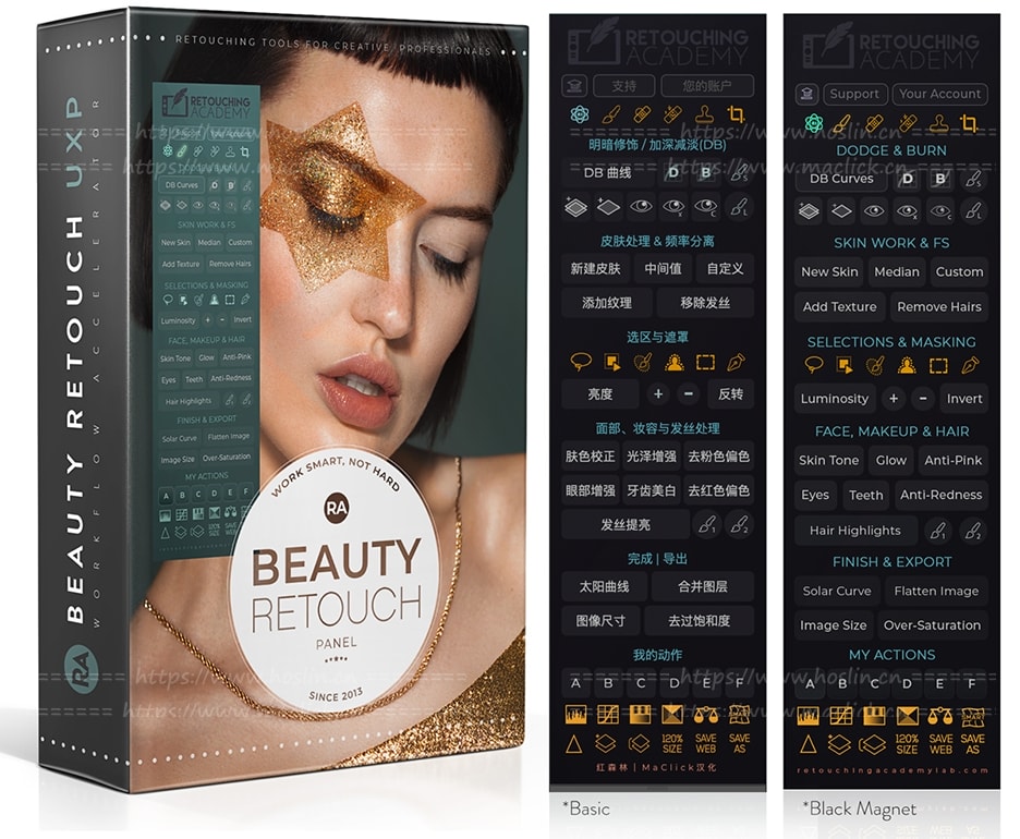 Beauty Retouch Panel 是一款 Photoshop 插件,专为希望更快地提供专业、高质量效果的摄影师和修图师而设计。即使您的修图工作始于 RAW 处理软件或基于 AI 的平台,大多数美妆和人像照片仍然需要在 Photoshop 中进行精细的后期处理。为此,Beauty Retouch Panel 面板是您最可靠的助手,可帮助您 更快、更稳定地获得专业级的修图效果。全新 Beauty Retouch v5 拥有 AI 驱动的 工具,可 在不牺牲质量的前提下加快您的工作流程。它配备了人工智能驱动的工具和脚本 ,可以 更快地进行专业级修图, 这是普通修图 AI 应用和平台无法实现的。您还可以添加 6 个自定义动作,并直接从面板界面运行它们。