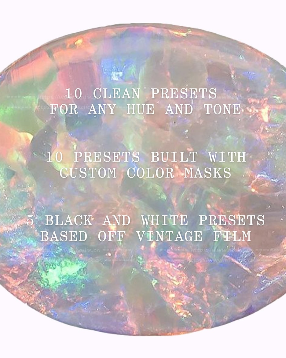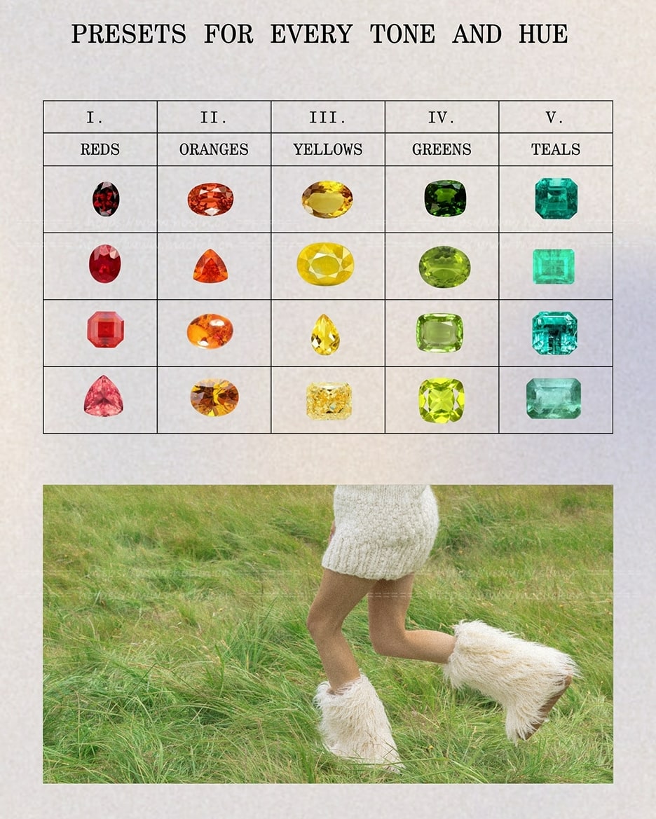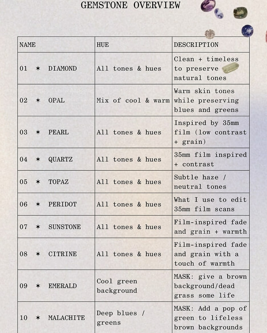 总共包含25个全新预设,每个预设都以一种宝石命名:10个适用于任何色调和色相的纯净预设,10个内置自定义颜色蒙版的预设,以及5个基于复古胶片的全新黑白滤镜。