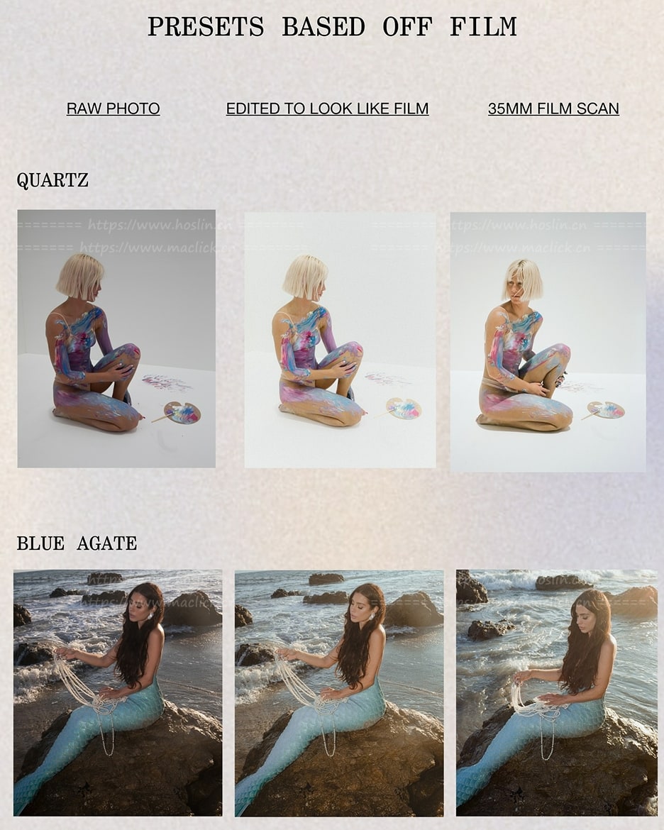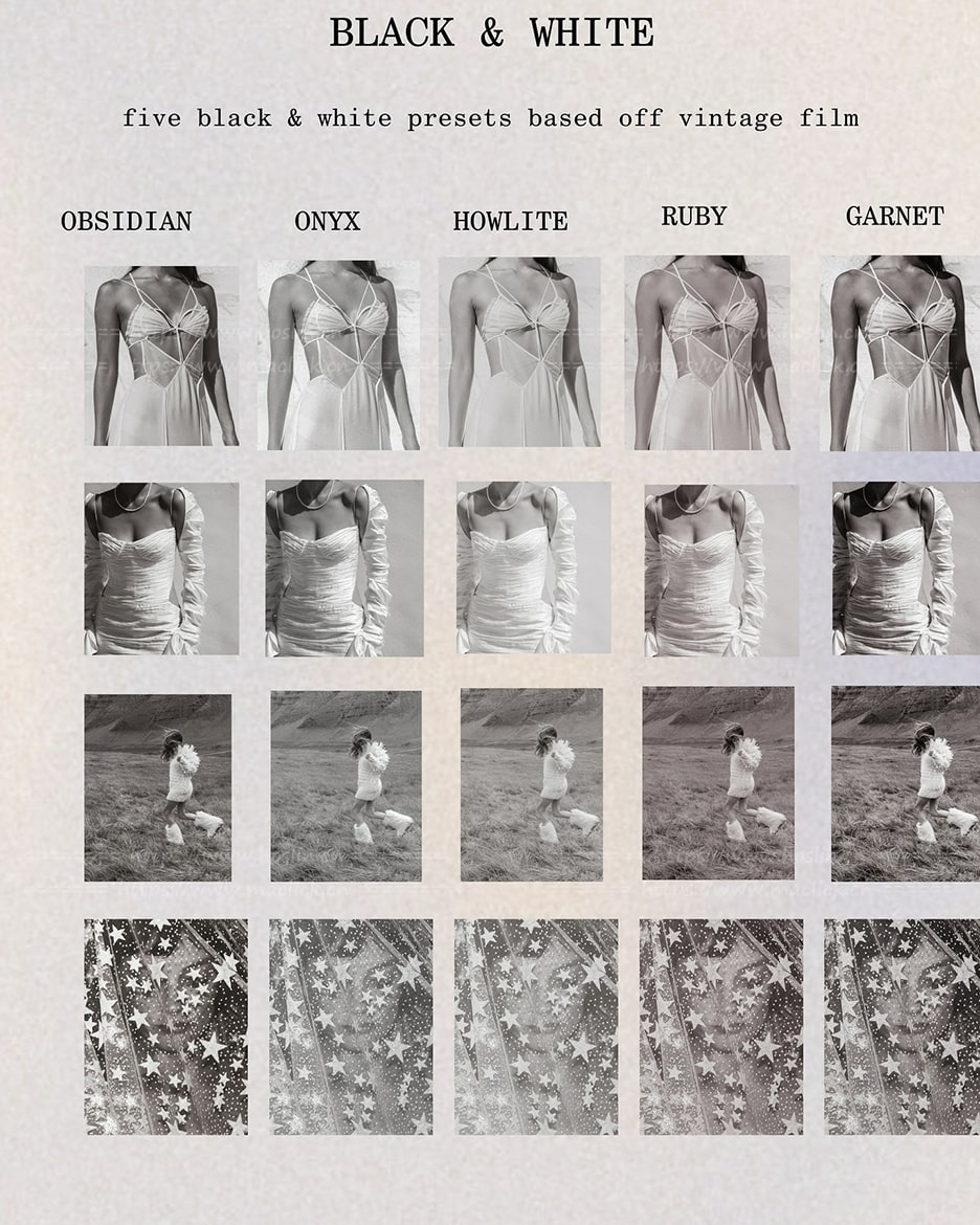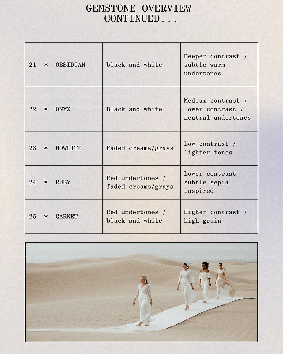 总共包含25个全新预设,每个预设都以一种宝石命名:10个适用于任何色调和色相的纯净预设,10个内置自定义颜色蒙版的预设,以及5个基于复古胶片的全新黑白滤镜。