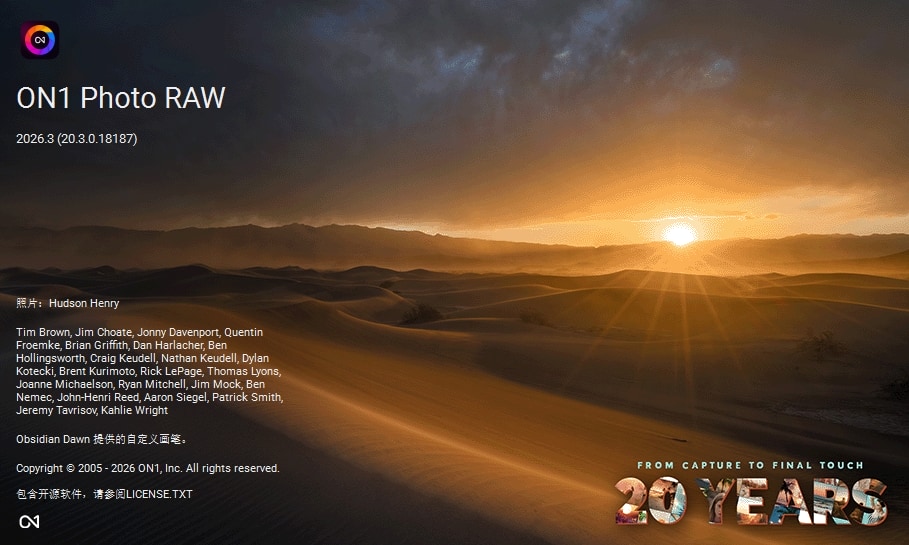 ON1 Photo RAW 2026 迎来重大升级,这是我们 20 年历史上功能最强大的新版本!体验闪电般的编辑速度、令人惊叹的 AI 蒙版、惊艳的新特效、极其清晰的放大效果等等。您只需轻点几下鼠标,就能轻松将一张平淡无奇的照片变成一张引人注目的佳作。然后快速进行风格调整和照片后期处理。ON1 Photo RAW 2026 搭载了强大的 AI 功能,旨在节省您的时间并呈现惊艳的效果。从用于超高分辨率的 Resize AI 2026,到用于智能色彩和色调调整的 Brilliance AI,再到用于精确选择的 Super Select AI 和蒙版图层,每一款工具都旨在让编辑更快、更轻松、更具创意。