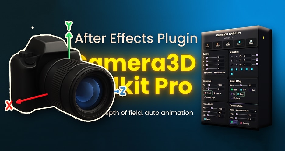 厌倦了花费数小时设置 3D 摄像机和手动创建关键帧?Camera 3D Toolkit Pro 简化了繁琐的技术设置,将 After Effects 变成专业的 3D 动画工作室。它提供即时摄像机设置、自动对焦跟踪、流畅的关键帧生成、逼真的摄像机抖动效果(包含 15 种以上的预设)、智能图层间距和电影级运动效果 – 所有操作只需单击一下即可完成。对于想要制作好莱坞级 3D 动画,但又不想使用复杂插件或昂贵插件的动态设计师、内容创作者和广告公司来说,Camera 3D Toolkit Pro 是理想之选。