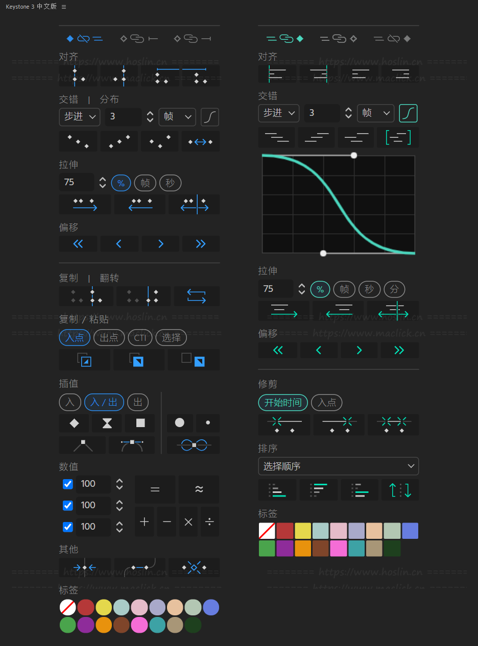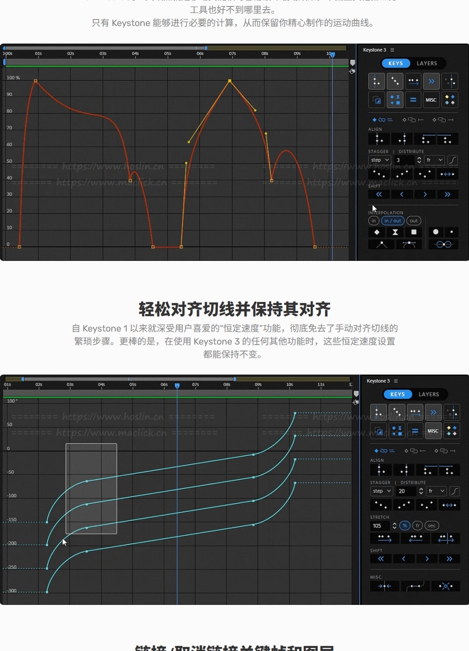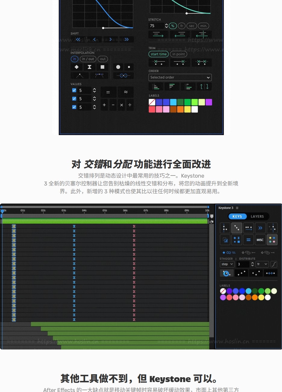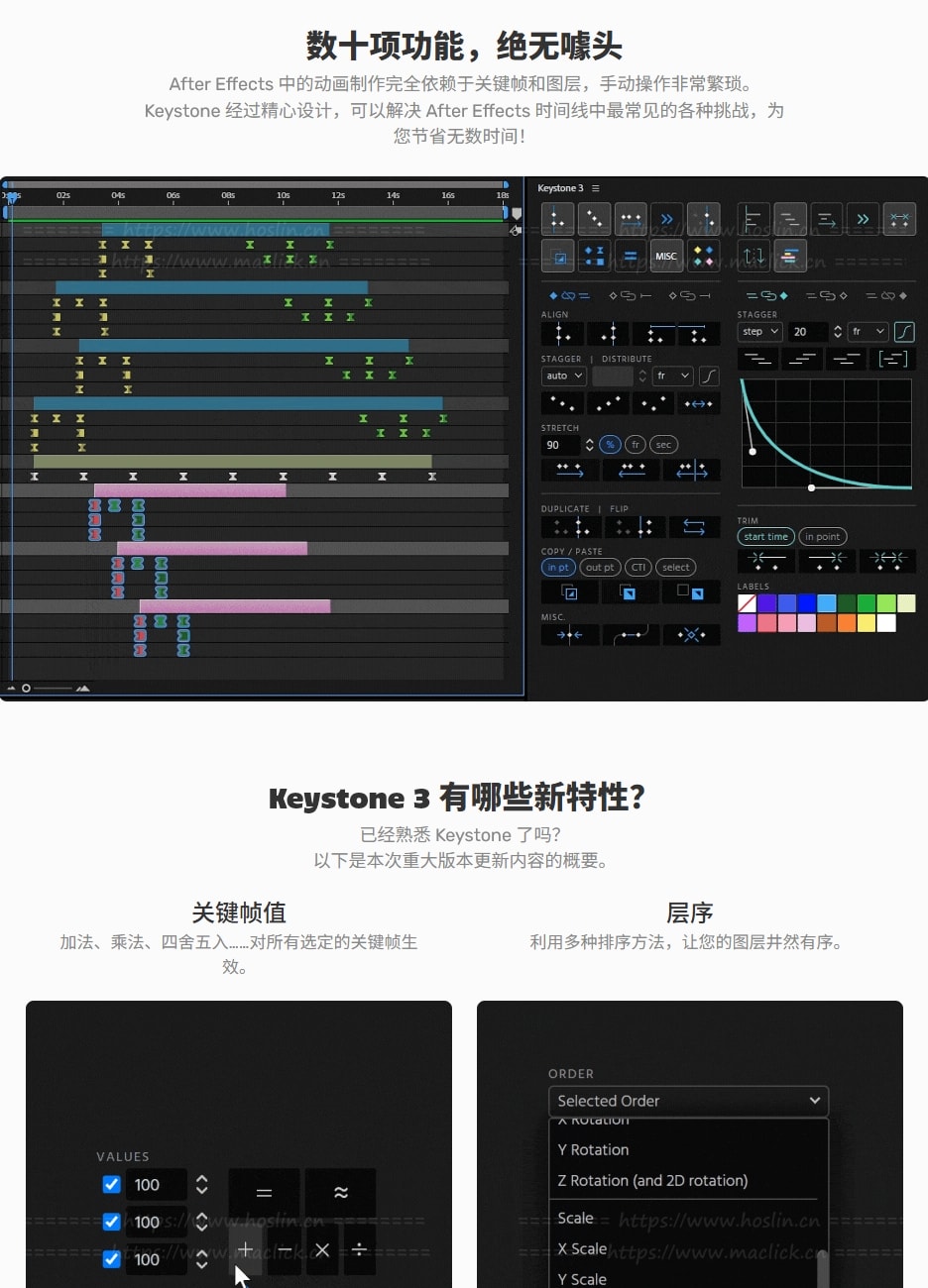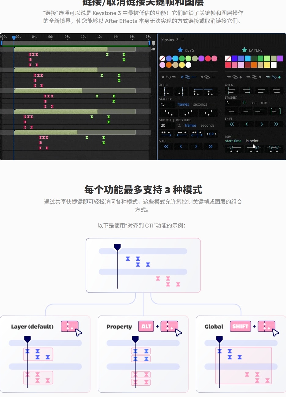 After Effects 中传统的动画制作完全依赖于关键帧和图层,手动操作非常繁琐。Keystone 3 经过精心设计,可以解决 After Effects 时间线中最常见的各种挑战,为您节省无数时间!Keystone 3 可快速对关键帧进行对齐、交错、排序、拉伸、颜色标签等等! Keystone 3的界面设计以速度和简洁性为核心,大多数操作只需单击一下即可完成。全新的分区快捷方式让您可以即时显示或隐藏分区,从而保持屏幕整洁,专注于工作。