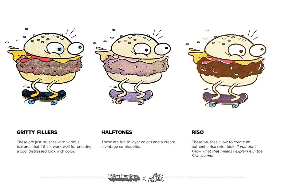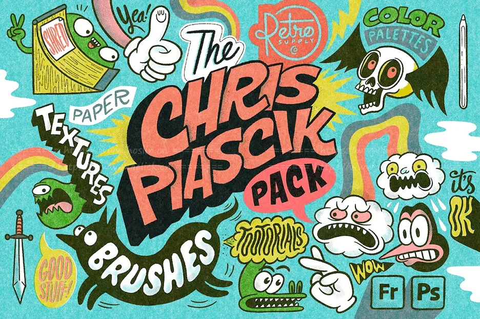 注:这是 Chris 使用的完整素材包 – 素材包中的大部分笔刷和纹理都来自 RetroSupply Co. 的现有素材包。指南、教程和调色板均为本素材包独有。