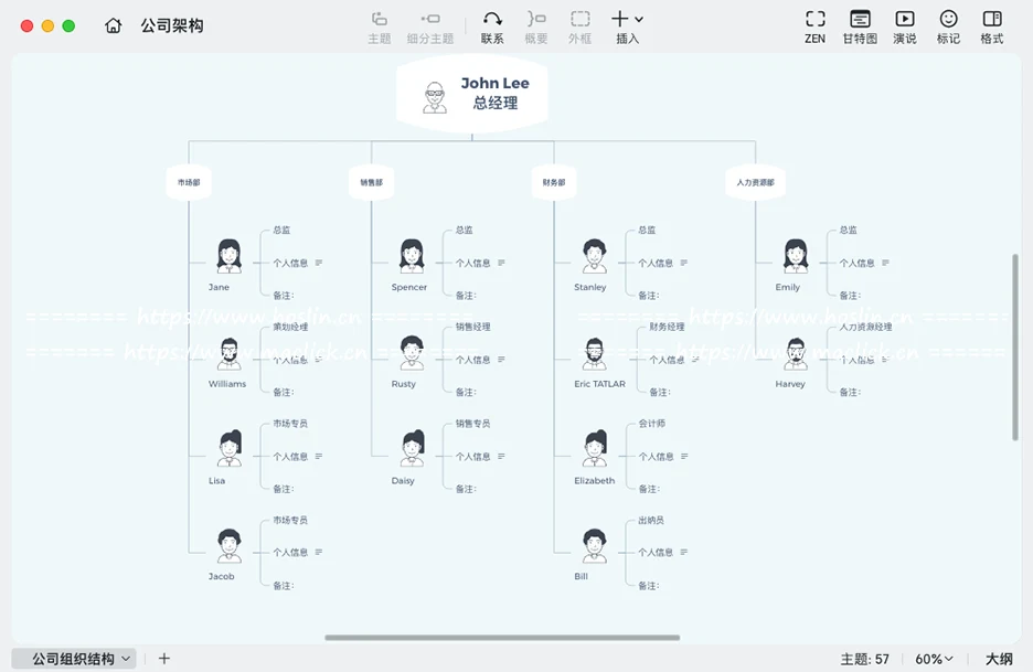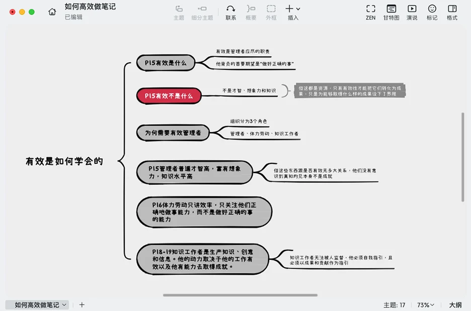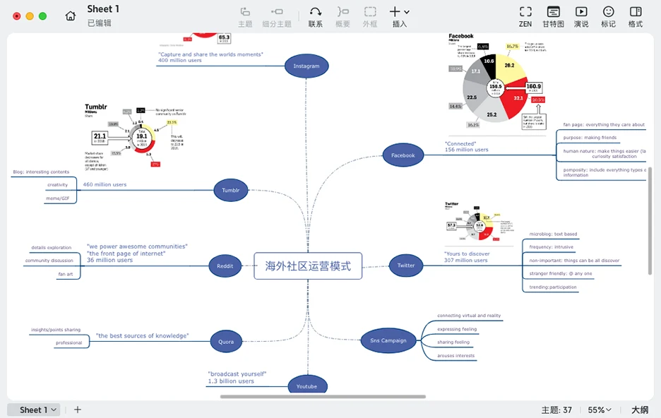 - 结构化呈现想法:利用合适的导图结构将模糊的观点具体化,将抽象的思维变成可执行的计划。通过充分的深度思考,跨越想到和做到的巨大鸿沟,让想法真正落地。