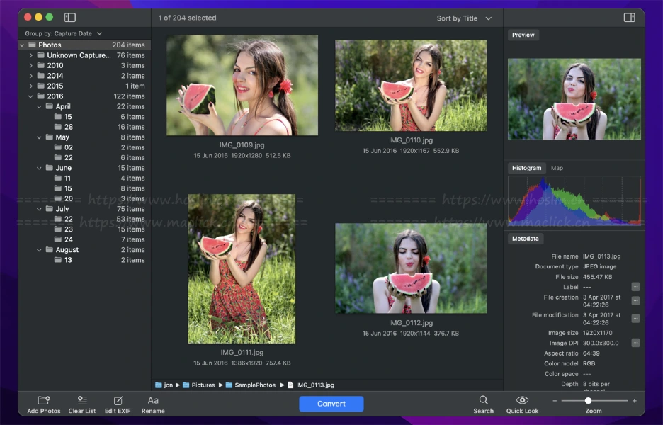 PhotoMill X 是一款适用于 macOS 的专业批量照片处理工具,它旨在将重复的图像处理任务简化为一个自动化流程。您可以拖入数千个文件,选择所需功能 – 转换、调整大小、重命名、添加水印、润饰、去除或编辑 EXIF/IPTC 信息、添加边框、创建联系表等等,然后一次性完成所有操作。