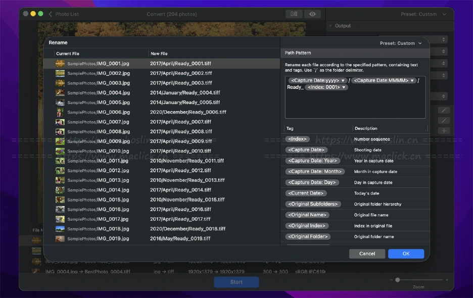 - 重命名引擎:功能强大的标记(日期、序列、EXIF 字段),具有大小写规则和填充。