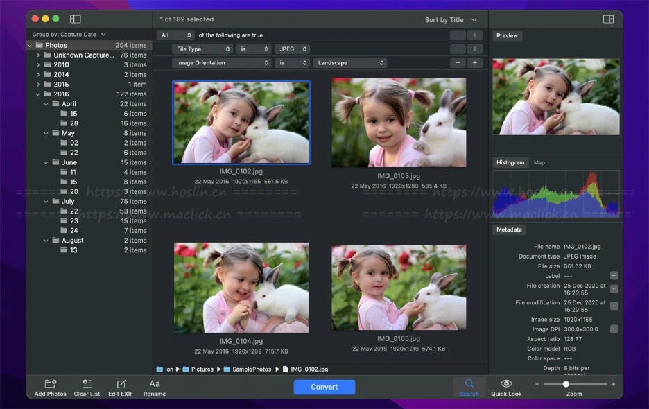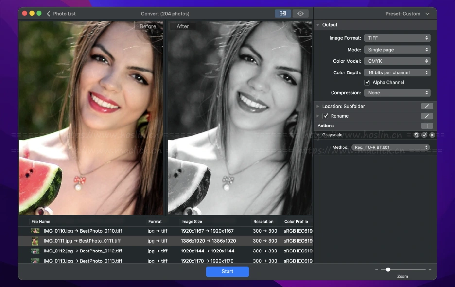 与基础转换器不同,PhotoMill X 可构建无损工作流程,并提供可重复使用的预设。您可以串联调整(曝光、对比度、色温、锐化、降噪),添加文本或图像水印,标准化色彩配置文件,并一次性输出多种尺寸和格式(例如JPG/PNG/TIFF/HEIC/WEBP)。快速预览面板会在处理前显示结果。PhotoMill X内置了强大的组织功能:智能重命名规则、文件夹镜像和元数据模板确保大型目录在网站、电子商务、档案库和客户交付等方面保持一致性。它基于 macOS 原生框架,并针对Apple Silicon进行了全面优化,能够流畅处理大批量照片,同时保持图像质量。