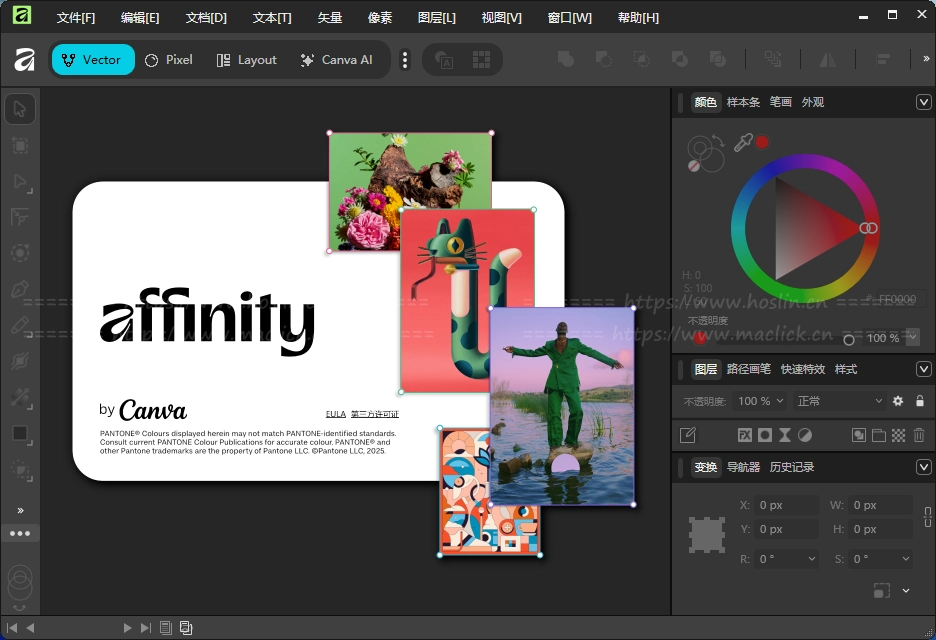 Affinity by Canva 是一个将矢量图形、照片编辑和页面排版整合到一款软件里的全能设计工具。它结合原来的 Affinity Designer、Affinity Photo 和 Affinity Publisher 功能于一体,无论是做 Logo、海报、杂志排版,还是照片修图、插画绘制,都能在同一个界面切换完成。