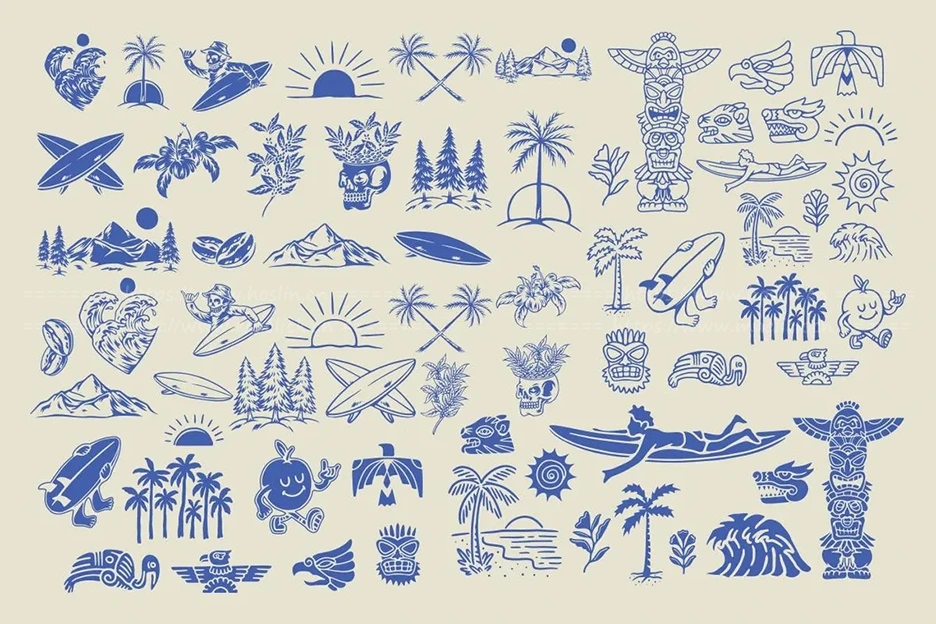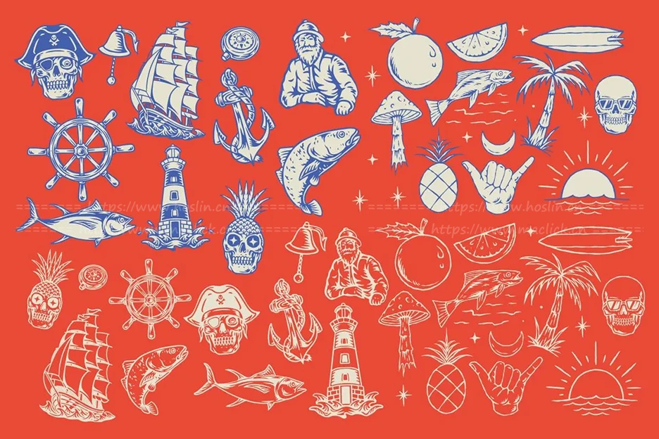 这款“夏日、海洋与水手”插画包带您开启一段复古之旅!它包含棕榈树、海浪、提基图腾、海盗、船只和阳光元素等复古风格的图形,非常适合用于品牌推广、包装设计、海报和带有航海风情的夏季周边产品。