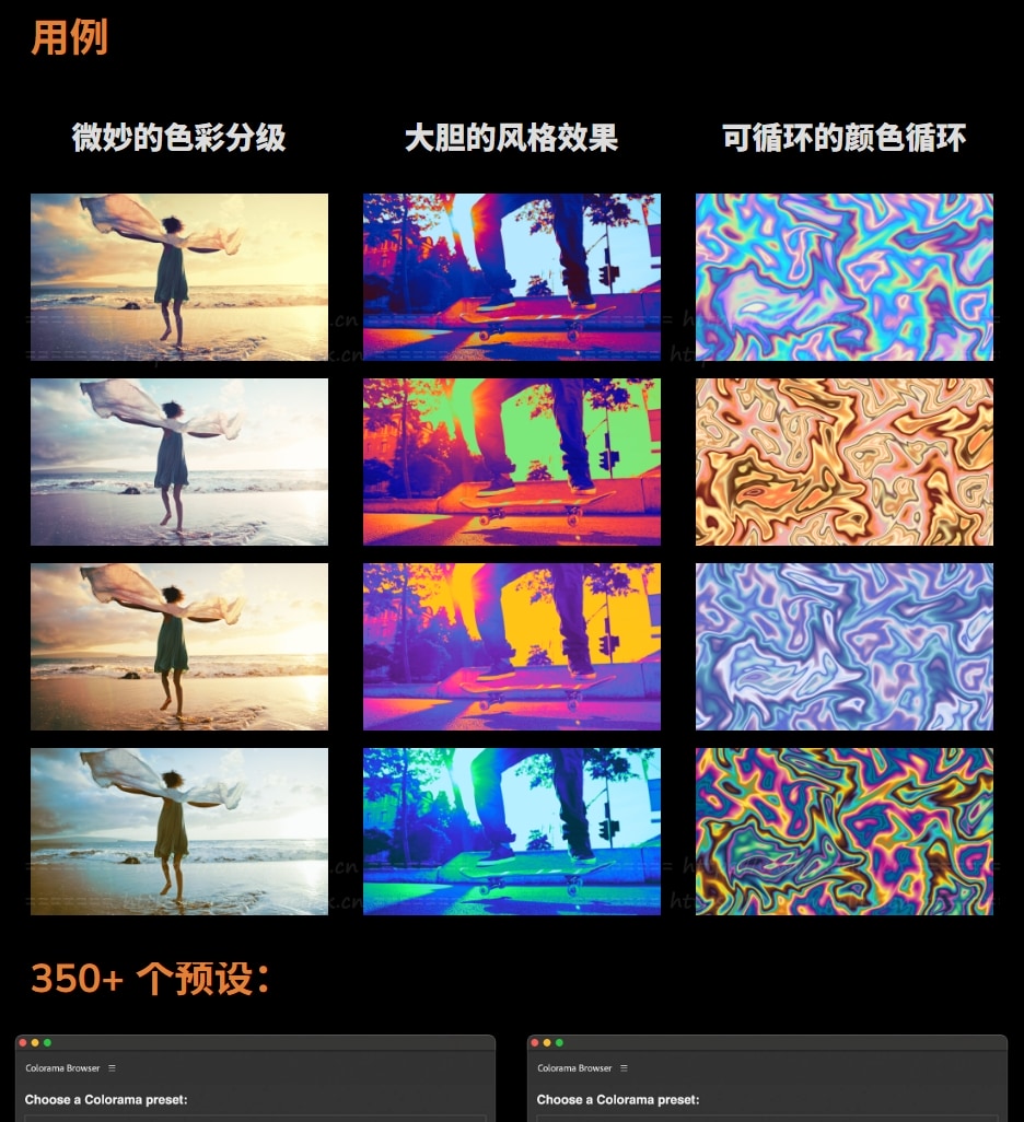 现在,您可以探索各种各样的创意可能性 – 从微妙的色彩分级到大胆的风格效果。浏览并应用各种渐变效果,满足您的所有创意需求,从自然的色彩和谐到迷幻的效果,再到金属光泽等等!