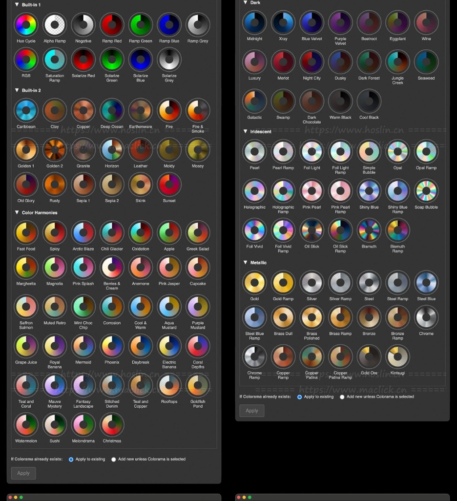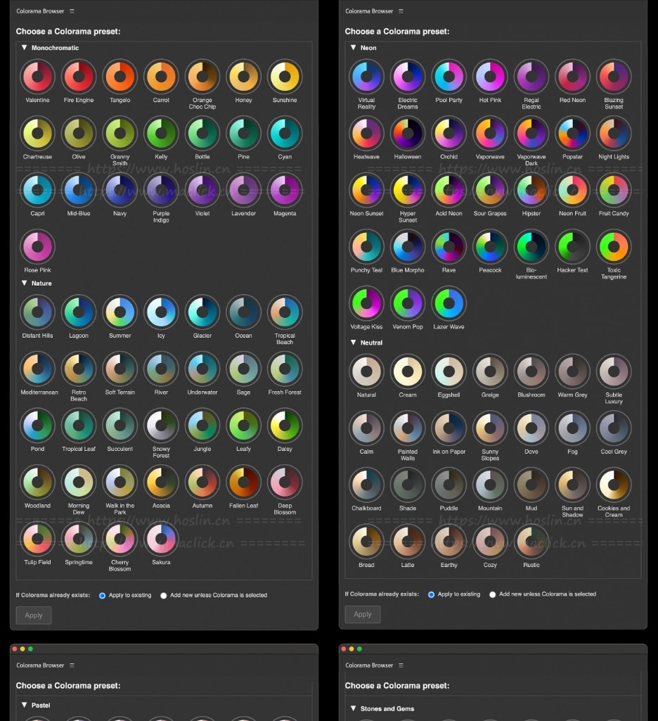Colorama 功能非常强大,但出了名的令人望而生畏 – 其繁琐的渐变编辑器意味着许多用户只会坚持使用一些内置预设。Colorama Browser 通过 400 多种精心挑选的渐变色改变了这种体验,您可以立即看到并应用这些渐变色,而无需费力地使用 Colorama 的渐变编辑器。