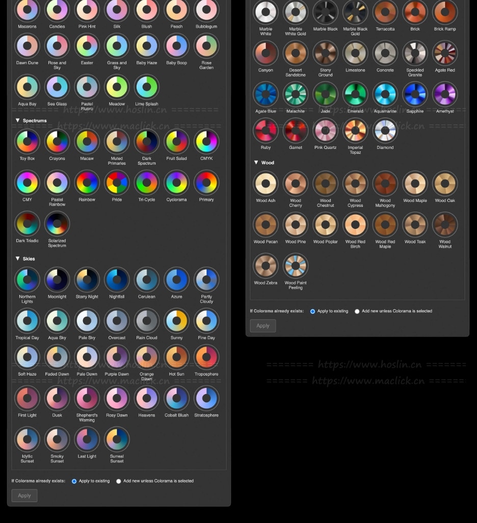 浏览 Colorama 精选的 400 多种渐变色,并可轻松应用它们,所有渐变色均配有可视化缩略图。