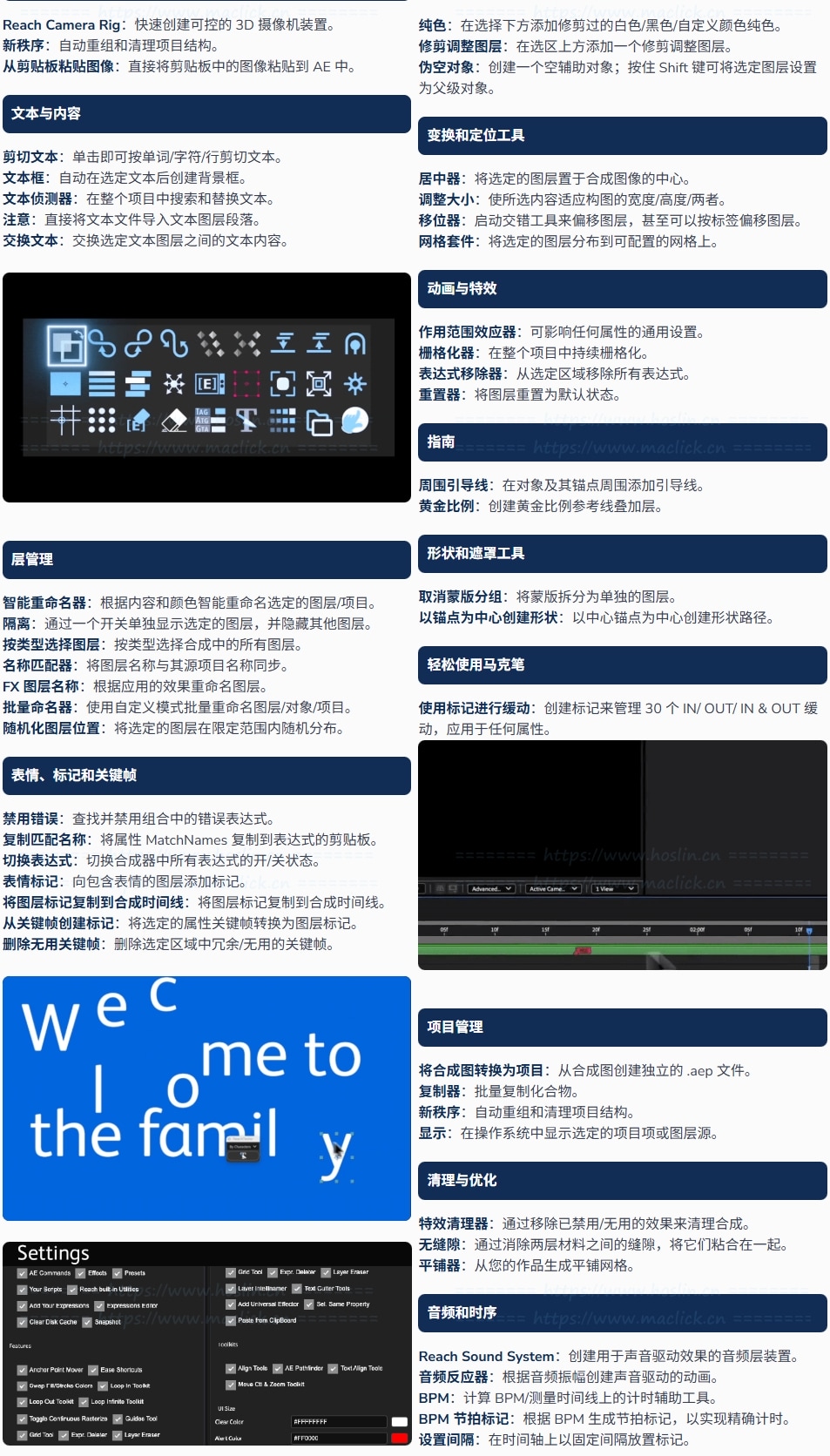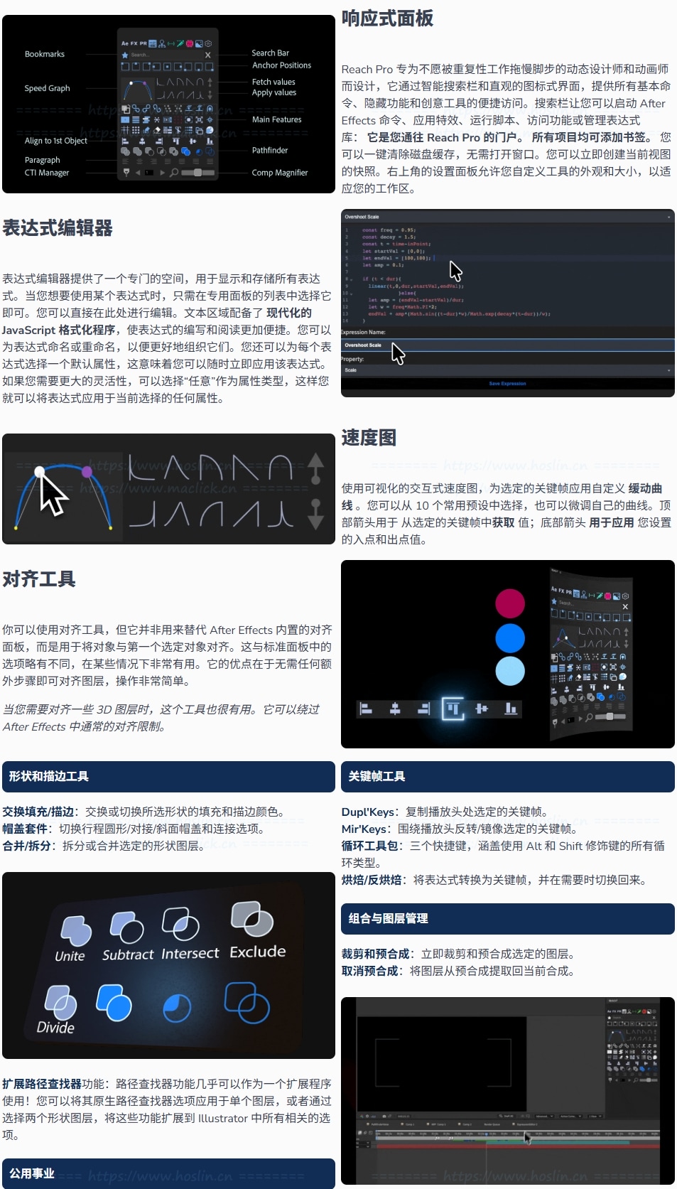 Reach Pro 3内置了大量实用功能,包括预编写的表达式库、表达式编辑器、脚本助手、表达式存储功能,以及对图层、关键帧、颜色管理、音频同步、合成优化等一系列工具的支持。无论是对齐、锚点管理、缓动调整还是快速裁剪、反弹效果、木偶针操作、摄像机控制,都有对应快捷工具,大幅简化繁琐重复的任务。从基础到复杂的任务,Reach Pro 都将常规操作提升到“简洁实用”的高度。