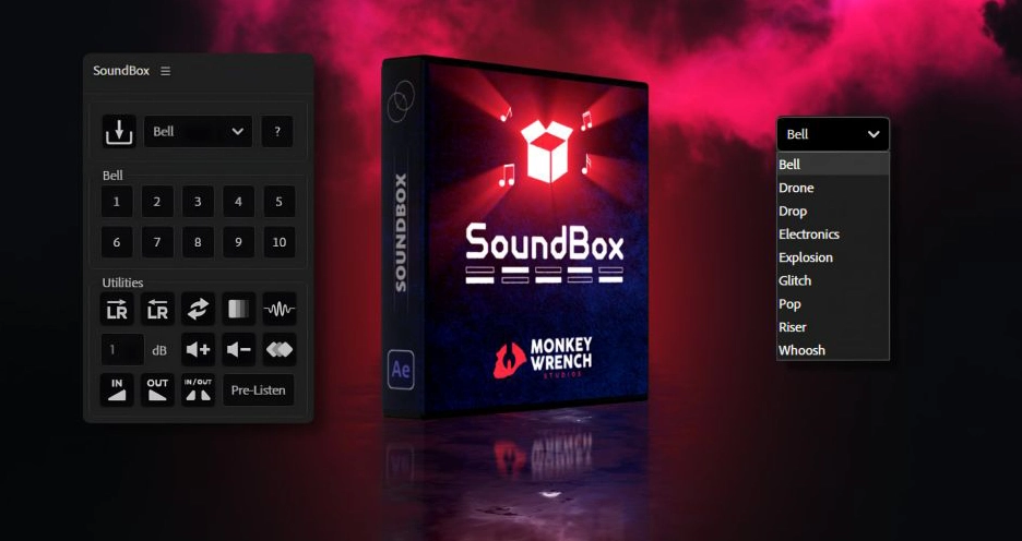 SoundBox 是在 After Effects 中处理音频的最简便方法。这款脚本让您可以快速轻松地向项目中添加音效,无需手动搜索和拖拽音频文件。您无需离开 AE 即可预览、添加和润色音效。平移、淡入淡出、反转、延迟、调制器、音量微调和“音频到关键帧”所有功能都集中在一个面板中。