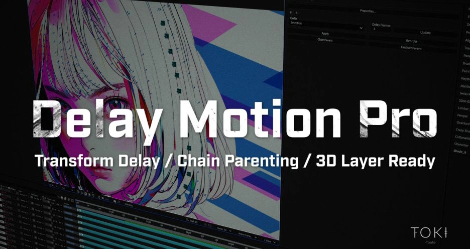 Delay Motion Pro 是一款面向 After Effects 的专业动画脚本,能快速生成稳定的变换延迟和跟随运动效果,无需手动编写复杂且易断裂的表达式或父子链设置。它自动构建可靠的控制结构,让图层(包括 2D/3D 的位置、旋转、缩放)产生自然的延迟运动,适合头发、尾巴、机械部件等动态动画,设置简单、可调性强、在实际项目中表现稳定可靠。