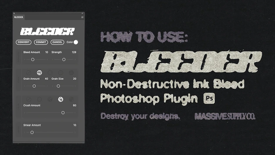 BLEEDER 是一款为 Photoshop 设计的墨水扩散效果插件,可实现非破坏性编辑,让你摆脱传统模糊、阈值等处理方法,快速做出逼真的印刷墨水渗开效果。插件通过转换图层为可编辑的 BLEEDER 组,让你随时调整渗透、颗粒、碎裂、纹理、墨水、轮廓 和涂抹等效果,像素级精准控制视觉效果,并实时预览结果。