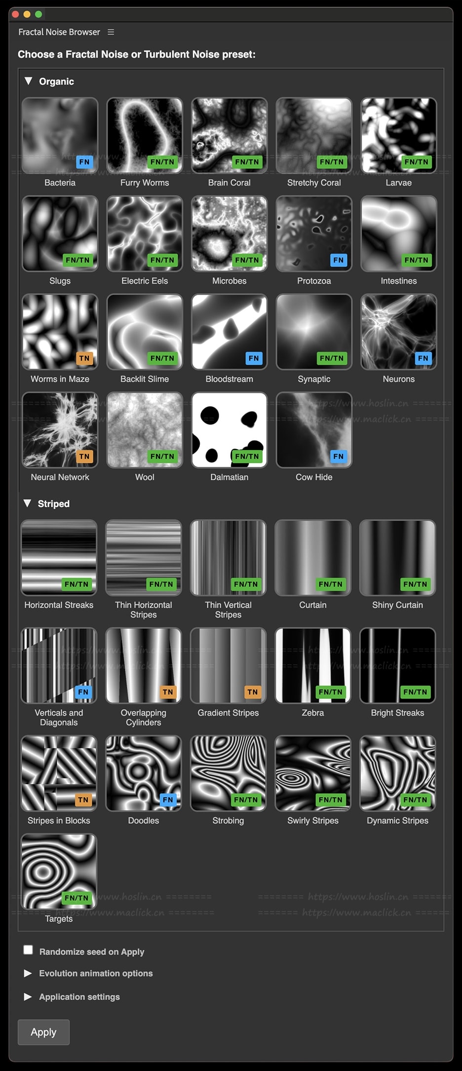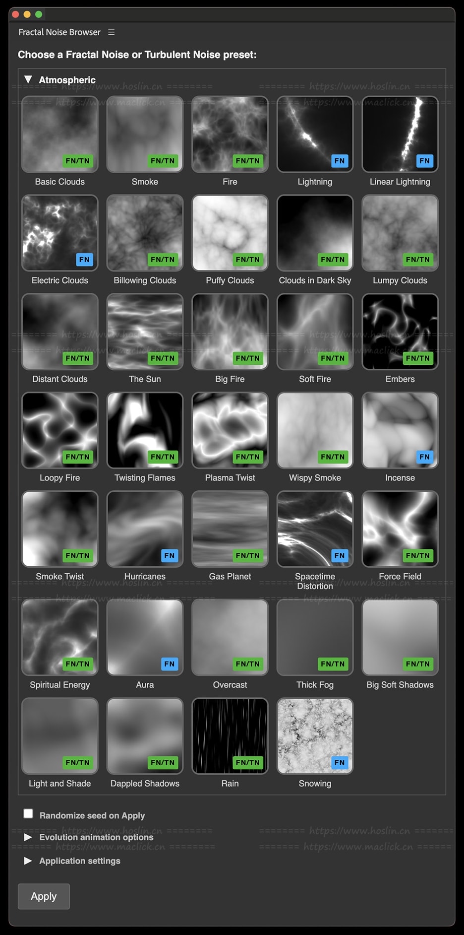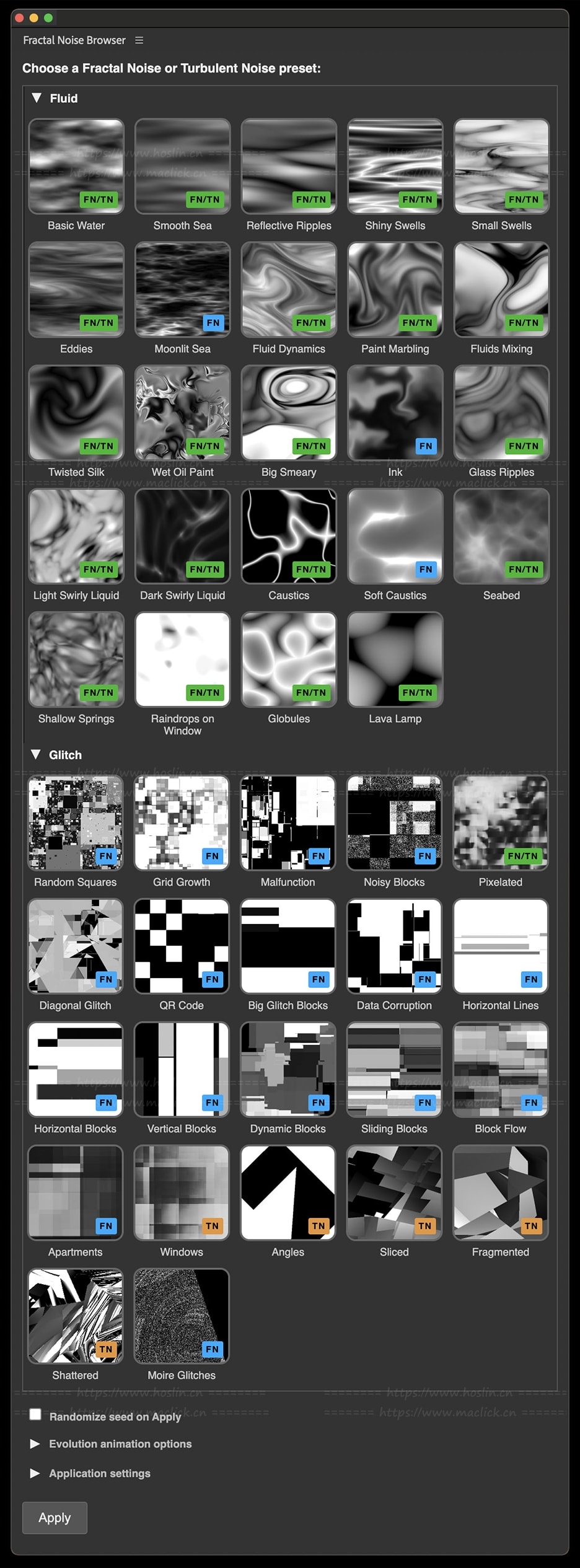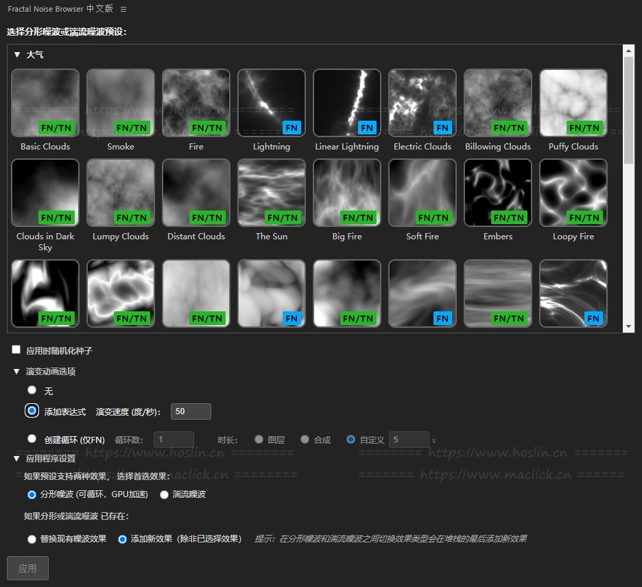 - 庞大的噪波预设库,带静态缩略图与动态演示;