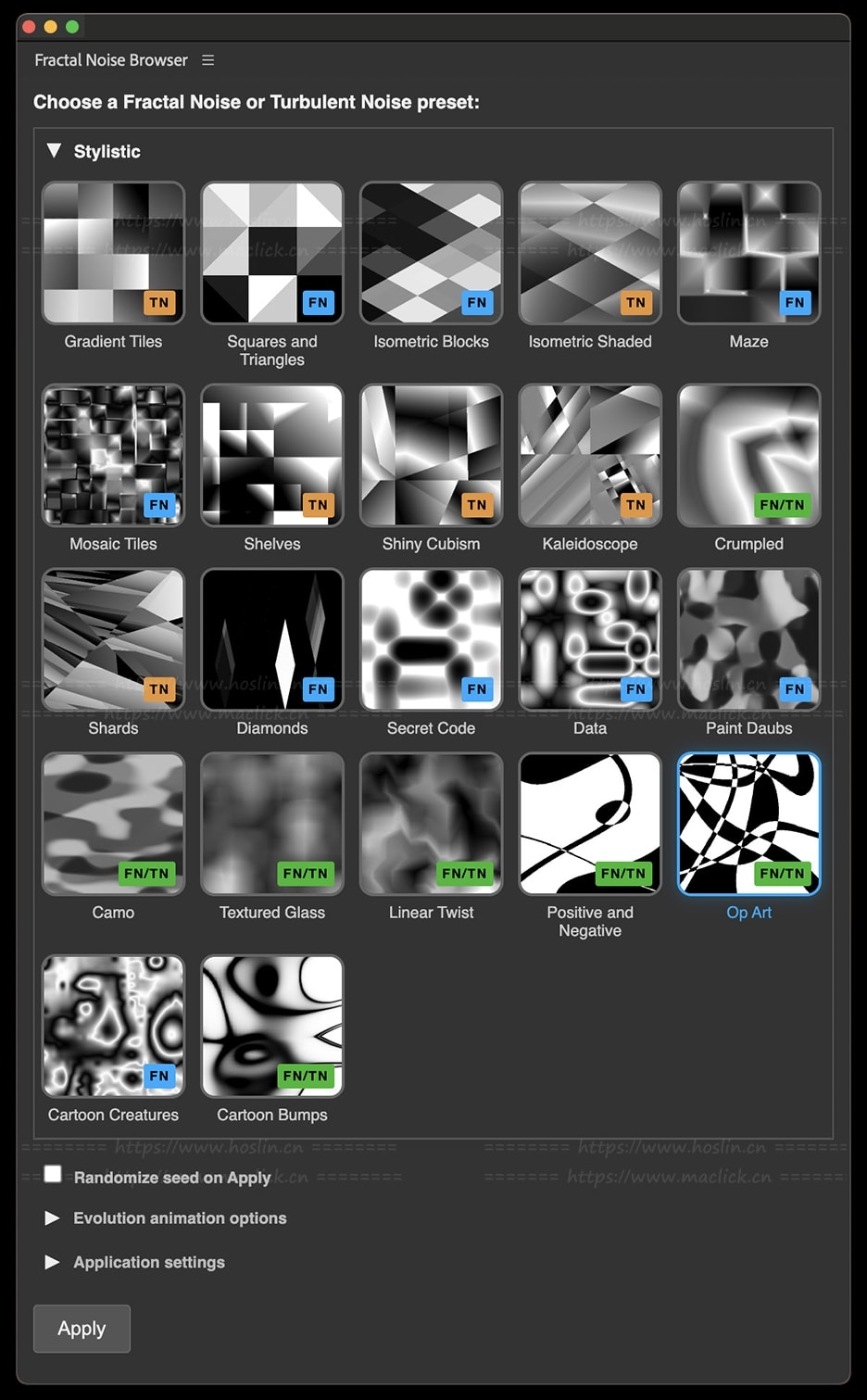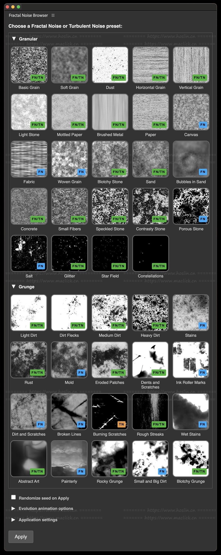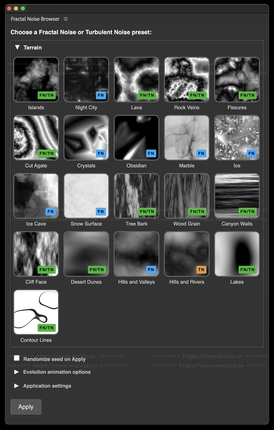 - 庞大的噪波预设库,带静态缩略图与动态演示;