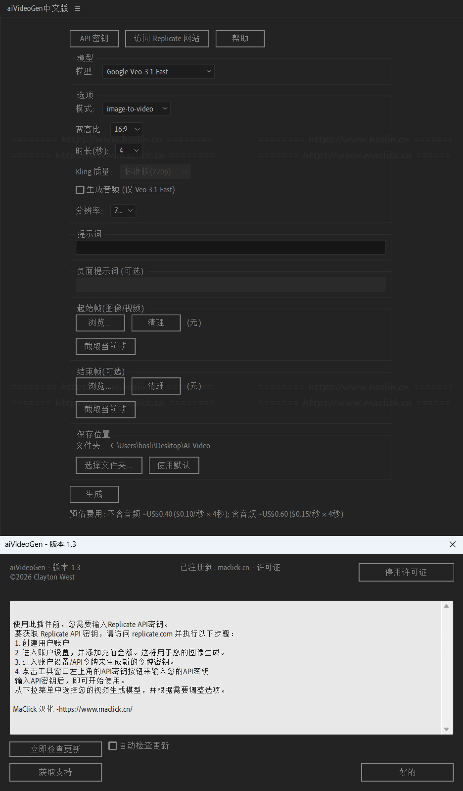 aiVideoGen 将 After Effects 直接连接到 Replicate 的顶级视频模型(Kling 2.1 / Master、Bytedance Seedance 1 Pro、Google Veo-3 Fast、Google Veo 3.1 Fast、Minimax Hailuo-02、Minimax Hailuo 2.3 Fast、PixVerse v5、WAN 2.2 Fast)只需输入提示词信息(可选地使用当前合成帧作为图像参考),结果将被下载、导入并放置在您的时间线上。***需要自备相关API密钥 (在 Replicate.com 注册)