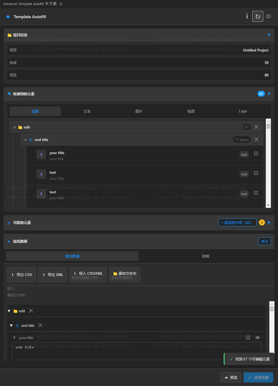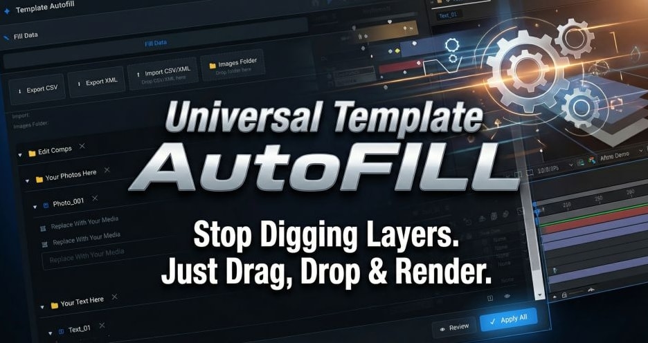 Universal Template AutoFill 是为 After Effects 设计的智能扩展工具,它能自动扫描复杂 AE 模板中的所有可编辑项(如文字、图片/LOGO、视频占位和控制器),并将它们集中呈现在一个面板里,让你可以在几分钟内批量填充整个项目,而不用一个个打开预合成手动替换。它支持从CSV 或 XML(可用 Excel 编辑)导入/导出数据,也可以通过设置一个媒体文件夹自动填充图片和视频占位,按名称排序、按日期排序甚至随机分配素材,还能检测并调整项目中的效果控制器如滑块、角度、点、下拉菜单等。应用前可以预览变更,且有可选备份以提升工作安全性。Universal Template AutoFill 特别适合用于如 Envato/VideoHive 等平台专业视频模板、幻灯片、社交媒体包或商业展示项目,尤其是那些包含大量占位元素的模板,可显著提高编辑效率、减少人工重复操作,节省大量时间。