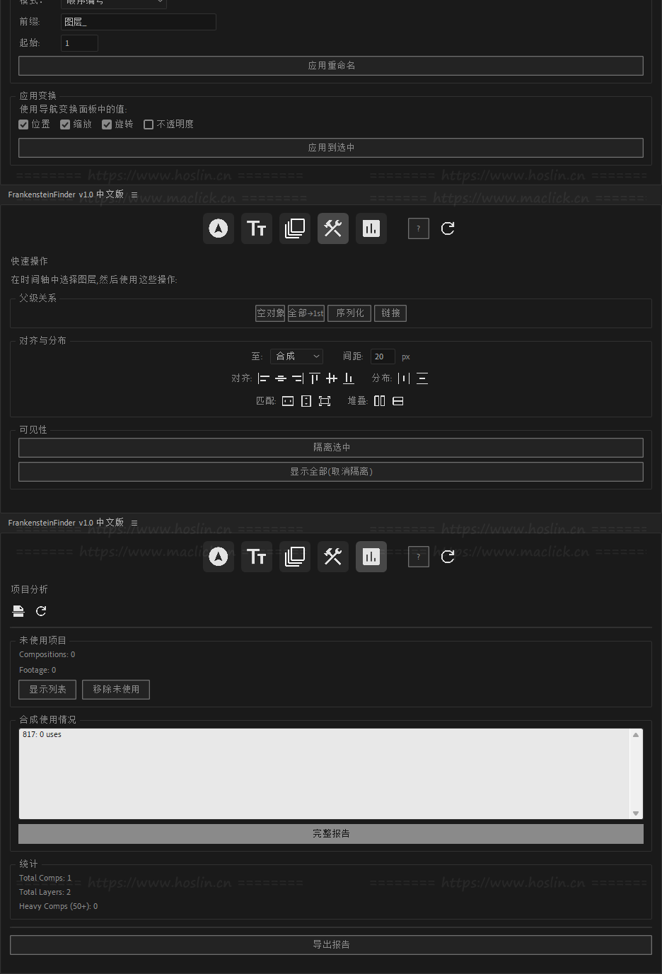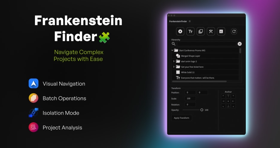 Frankenstein Finder 是一款功能强大的 After Effects 项目导航和工作流程工具包。它支持浏览复杂的嵌套合成、在不破坏时间线的情况下隔离图层,以及执行通常需要数小时才能完成的批量操作,所有这些都可以在一个可停靠的面板中完成。Frankenstein Finder 拥有可视化合成层级结构,编辑嵌套合成中的文本,并批量重命名图层。使用“隔离模式”和“全部显示”功能,即可即时控制图层可见性。此外,它还包含深度项目审核功能,可在单个可停靠面板中清理未使用的资源。Frankenstein Finder 专为处理大型项目的动态设计师打造,它改变了您管理图层、组织时间线以及在 200 多个图层的合成中保持条理的方式。