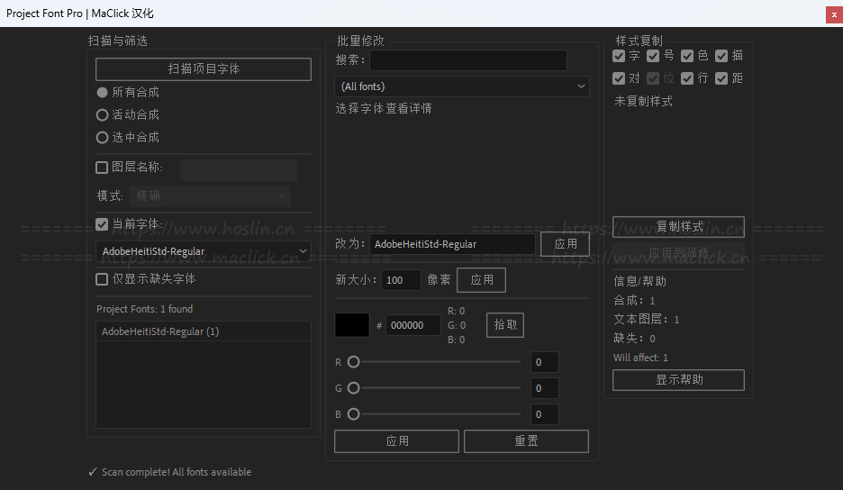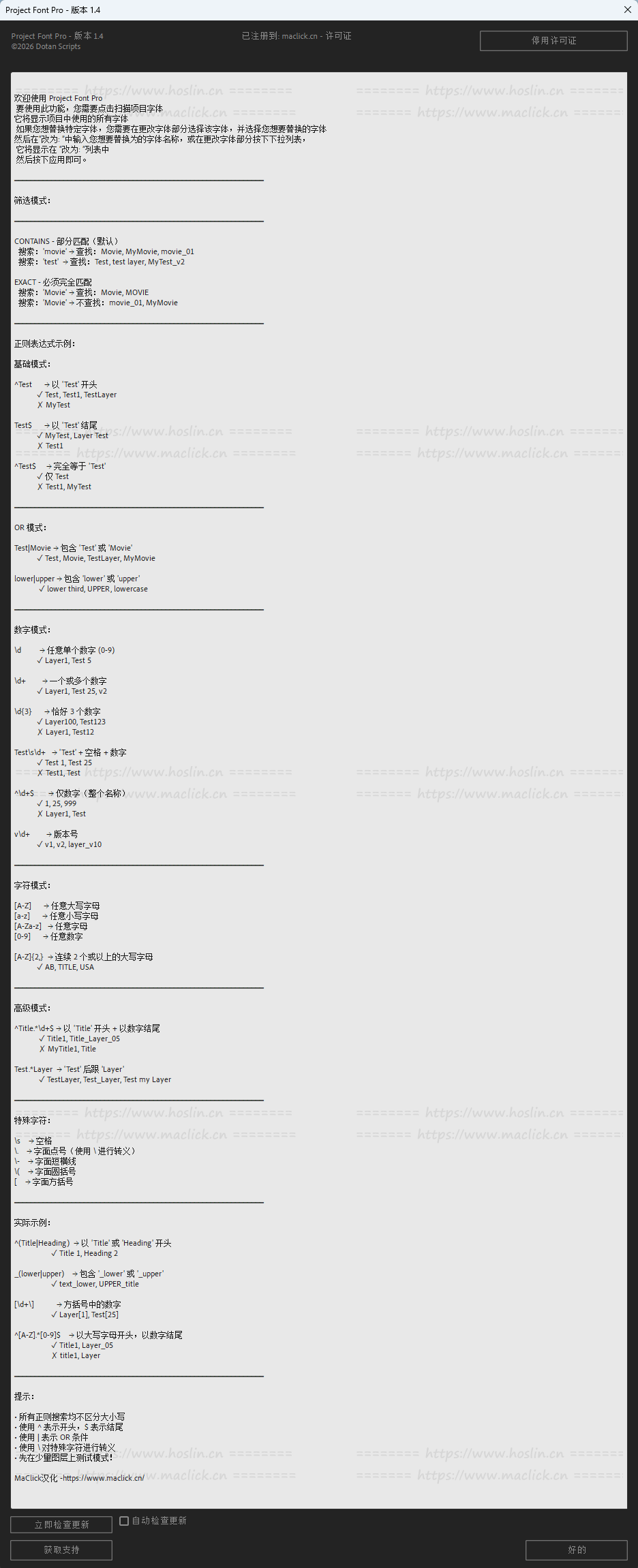 使用 Project Font Pro 可用于快速批量替换项目中的字体,大幅提升处理文字层时的效率。你可以根据需要在整个工程、选定合成或当前合成中搜索字体,并将某种字体替换成另一种,同时还能只替换字体粗细、大小、颜色或对齐方式等属性。它支持按字体名称过滤、预览每种字体出现的图层数量,还能一键打开包含该字体的合成,方便定位和修改。另有“抓取样式”功能,可从某个图层提取字体样式并应用到其他字体上,使样式统一更简单。Project Font Pro 是处理大项目字体统一、风格修改、丢失字体快速修复的高效工具。