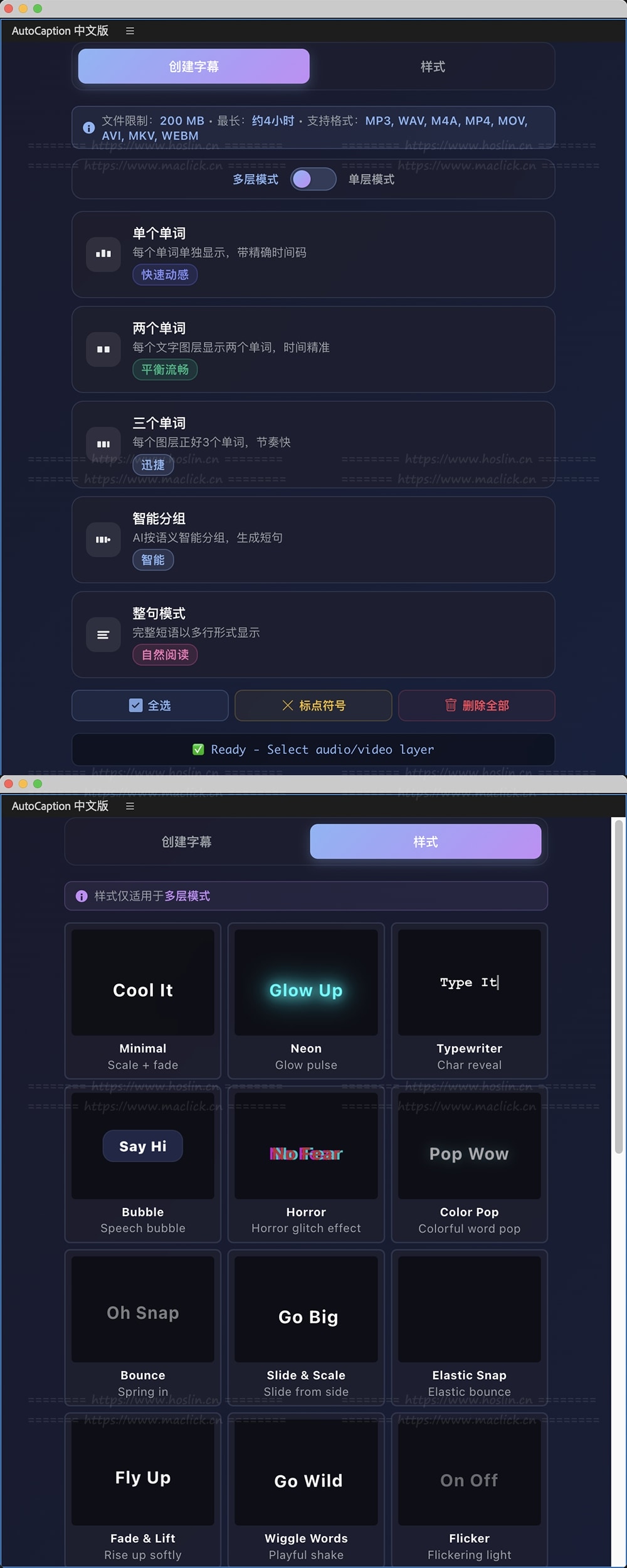 AutoCaption 提供多种字幕节奏模式(例如单词、双词、短句、智能分组及整体句子模式)来匹配不同内容的节奏与叙事风格,你还可以从数十种内置字幕样式中选择,或自由调整字体、颜色、行距、位置和动态效果,使字幕更具视觉表现力。生成后字幕依然保留 AE 原生灵活性,可随时修改文字、时间点和动画。AutoCaption 支持多语言识别(包括中文、英语等 99 种语言)并可处理清晰的歌曲歌词,是制作社交媒体视频、讲解片、Vlog 或动态字幕设计的高效工具,而且无需 API Key、无次数限制,使用便捷。